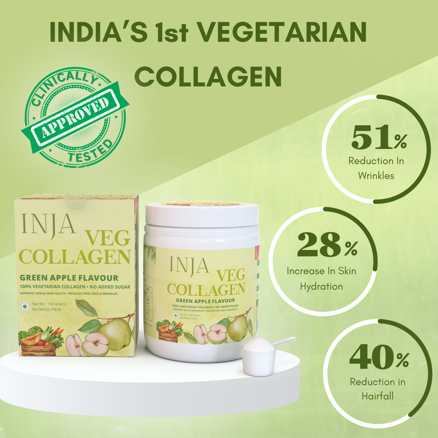 Inja Veg Collagen Powder is a vegetarian collagen peptide having an amino acid profile like animal-derived collagen. This product has revolutionised the vegetarian collagen market by being nothing like the collagen booster or builder that has 0 Collagen as an ingredient. Inja Veg Collagen has Collagen itself as an ingredient and shows results. INJA Veg Collagen comes in a 150-gram jar of unflavoured collagen. It comes with a 5-gram scoop inside. Collagen is the most abundant structural protein in the human body. 30% of our body's and 70% of our skin's protein is collagen. It is the glue holding all together: skin, bones, muscles, blood vessels, tendons, cartilage, teeth. Why do we need INJA Veg Collagen? Our body naturally produces collagen, but as we grow older, our body continuously slows down the production of collagen, which is why we start ageing faster, internally and externally. Collagen reduces our bodies due to stress, tobacco, high sugar diet and overexposure to UV rays, causing fine lines, wrinkles, hair fall and more.
