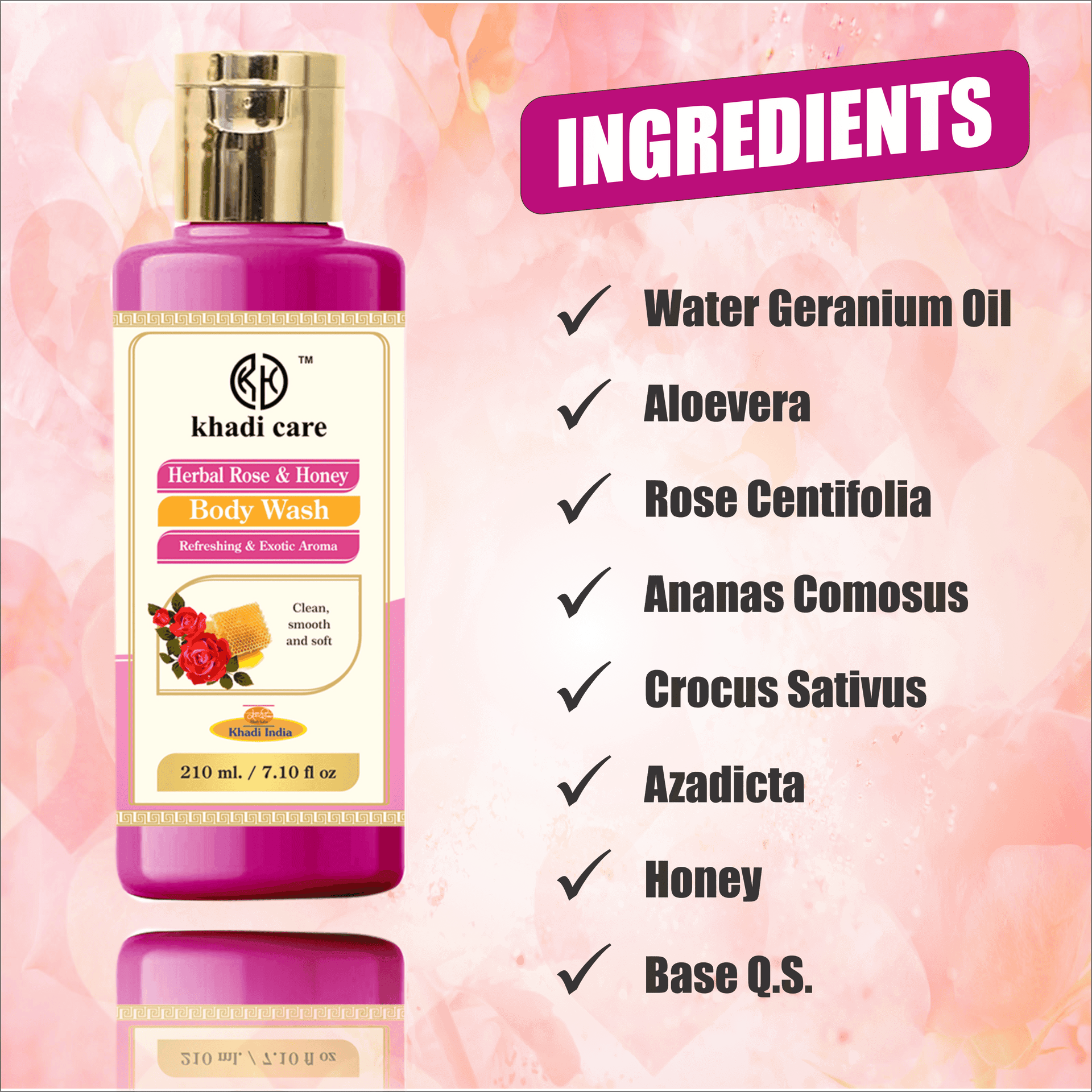 Khadi Care Herbal Rose & Honey Body Wash indulge your senses with beautiful soap-free cleansing gel that will leave your skin feeling cleansed, refreshed and soft with a whisper of beautiful rose fragrance.