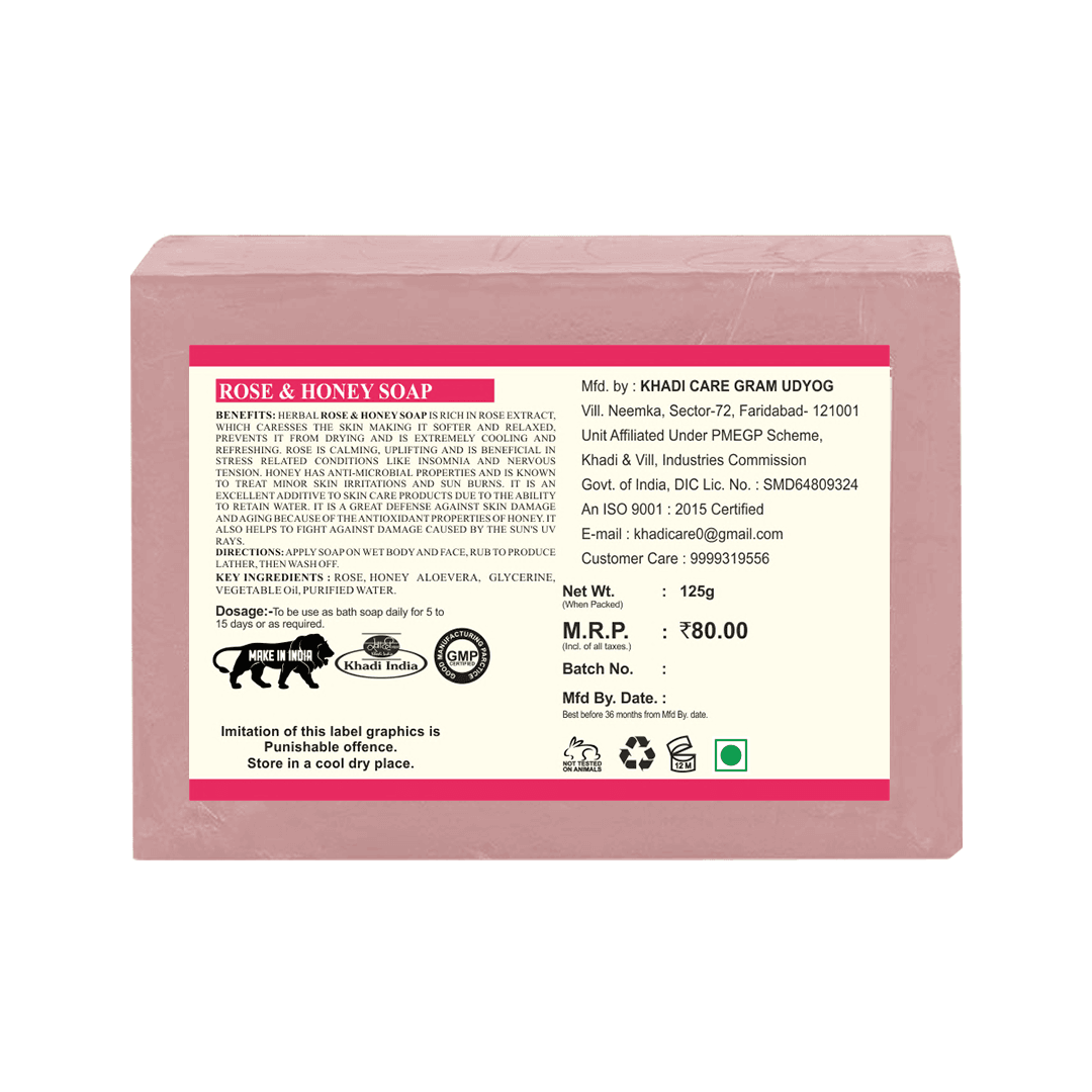 Khadi Care Herbal Rose & Honey soap is rich in Rose Extract, which caresses the skin making it softer and relaxed, prevents it from drying, and is extremely cooling and refreshing. Rose is calming, and uplifting and is beneficial in stress-related conditions like insomnia and nervous tension. Honey has anti-microbial properties and is known to treat minor skin irritations and sunburns. It is an excellent additive to skin care products due to its ability to retain water. It is a great defense against skin damage and aging because of the antioxidant properties of Honey. It also helps to fight against damage caused by the sun's UV rays.