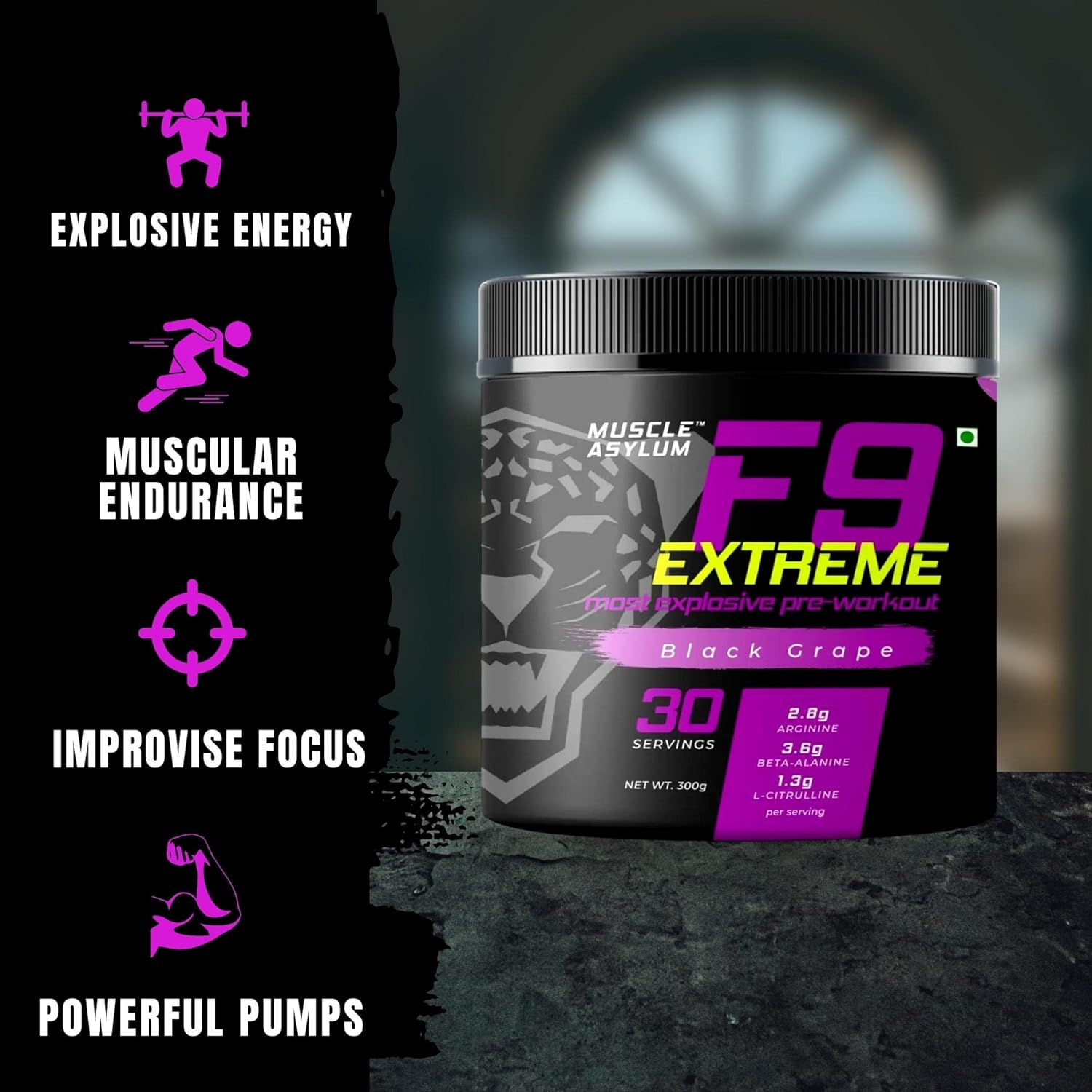 Muscle Asylum F9 Extreme – High Caffeine Pre-Workout (Black Grape) | 300g | 30 Servings | EAA & Endurance Blend | High Stimulant with EAA & Beta-Alanine