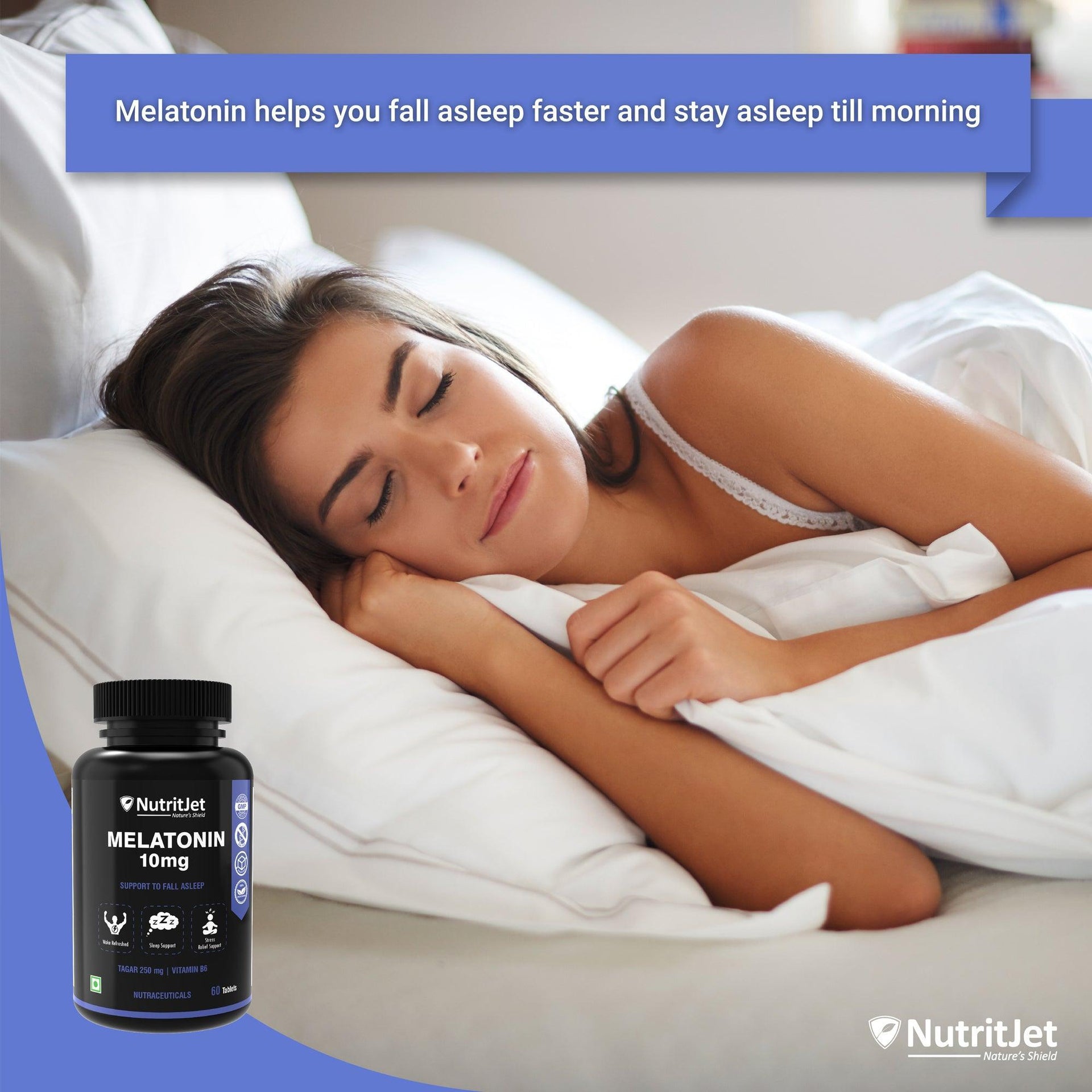 NutritJet Melatonin 10mg Tablet is beneficial for regulating the sleep-wake cycle and promoting calm and restful sleep. Melatonin helps manage anxiety and stress and relaxes the body and mind for deep and sound sleep. This product is non-habit forming, drug-free, and has no preservatives.