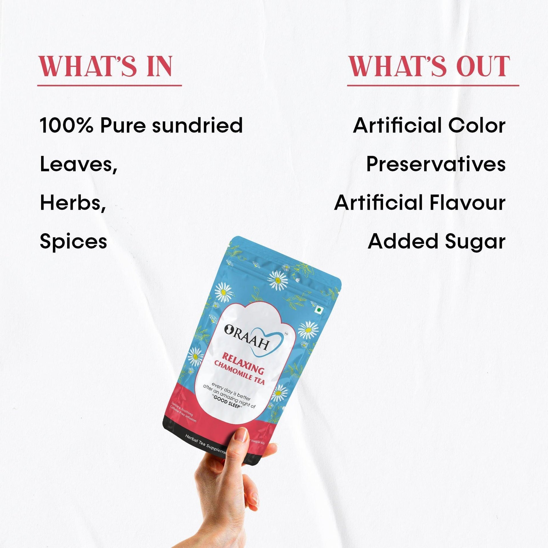 Oraah Relaxing Chamomile Tea is naturally caffeine-free herb is refreshingly sweet yet relaxing. Chamomile herb is known for centuries for its calming, soothing and digestive properties. As a herbal tea, chamomile has many health benefits and is known to help with restlessness, sleeplessness, anxiety, menstrual cramps and digestive ailments.