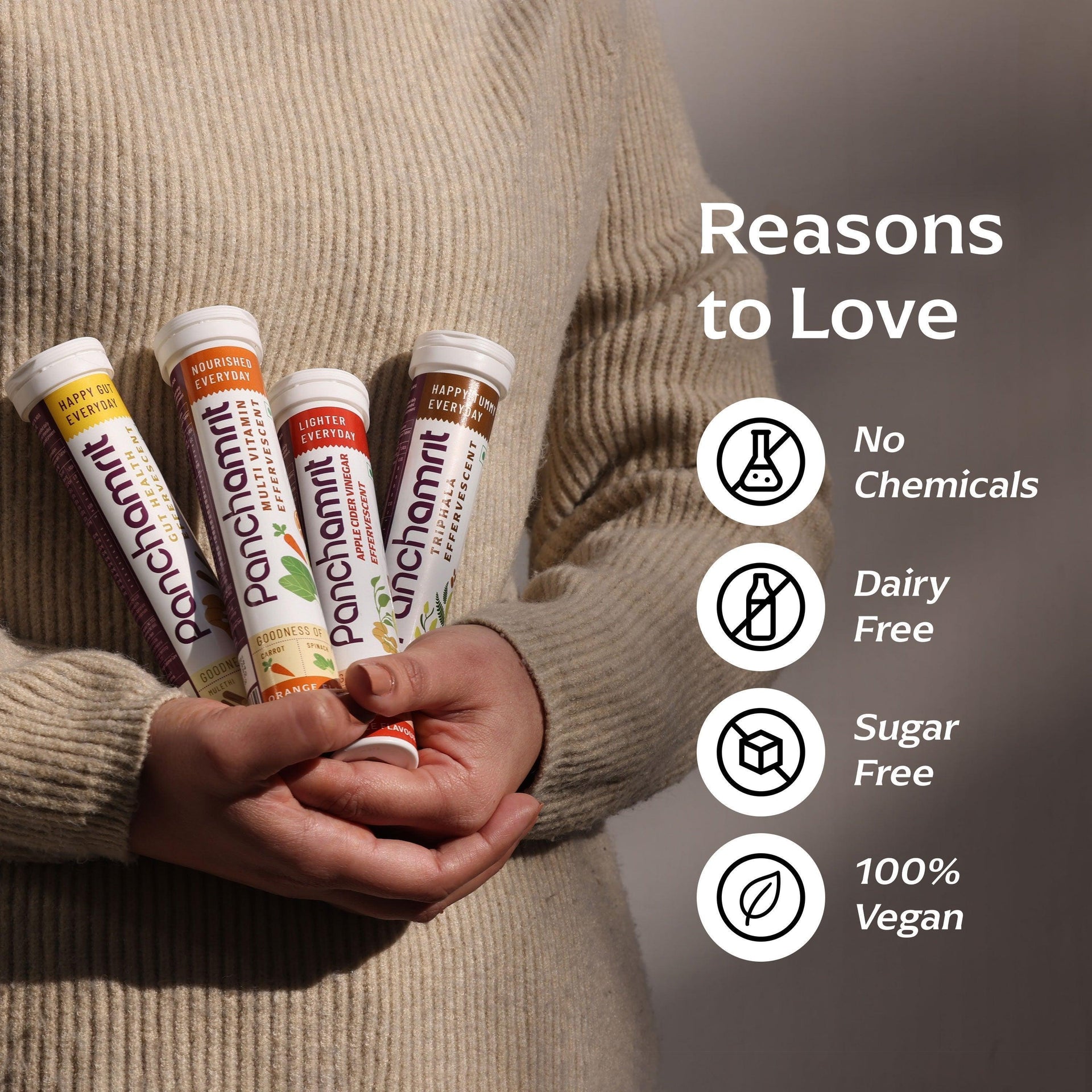 Panchamrit Gut Health Effervescent Tablets is a specialised formulation designed to support digestive wellness with the refreshing tang of zesty lemon. These effervescent tablets are crafted to aid in maintaining a healthy gut environment and optimising digestive functions.