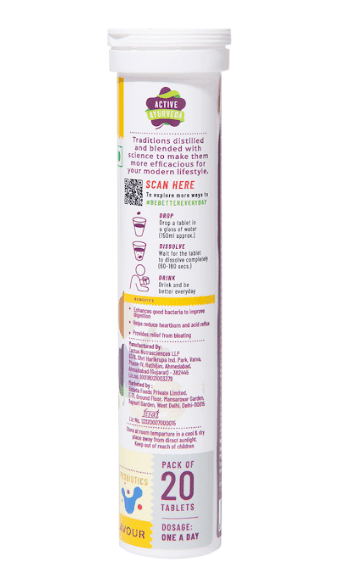 Relieves acidity and bloating: Mulethi, the key ingredient in these effervescent tablets, is a powerful Ayurvedic formulation that soothes the stomach lining and reduces acidity. Enriched with Adrak (Ginger) and Elaichi (Cardamom) this winning formulation helps soothe the digestive system, reduces bloating, and supports healthy gut functioning. The natural probiotics in the tablets begin to balance the gut microbiome, promoting a healthier gut environment