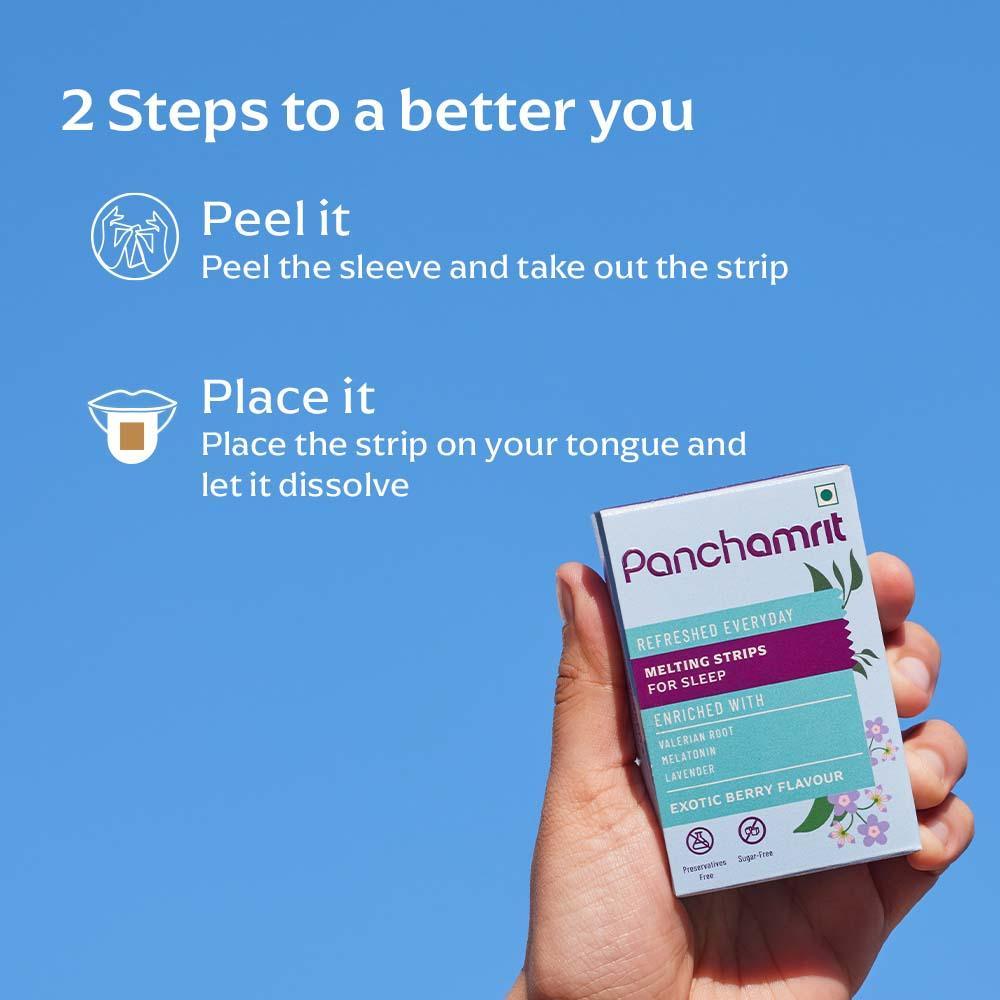 Helps fall asleep faster: Panchamrit Melting Strips for sleep are uniquely crafted with melatonin, lavender, valerian root, and chamomile to enhance sleep quality and regulate the sleep cycle. These 100% bioavailable melting strips, curated by Ayurvedic experts, are fast-dissolving and they provide a hassle-free solution for supporting a peaceful night's sleep