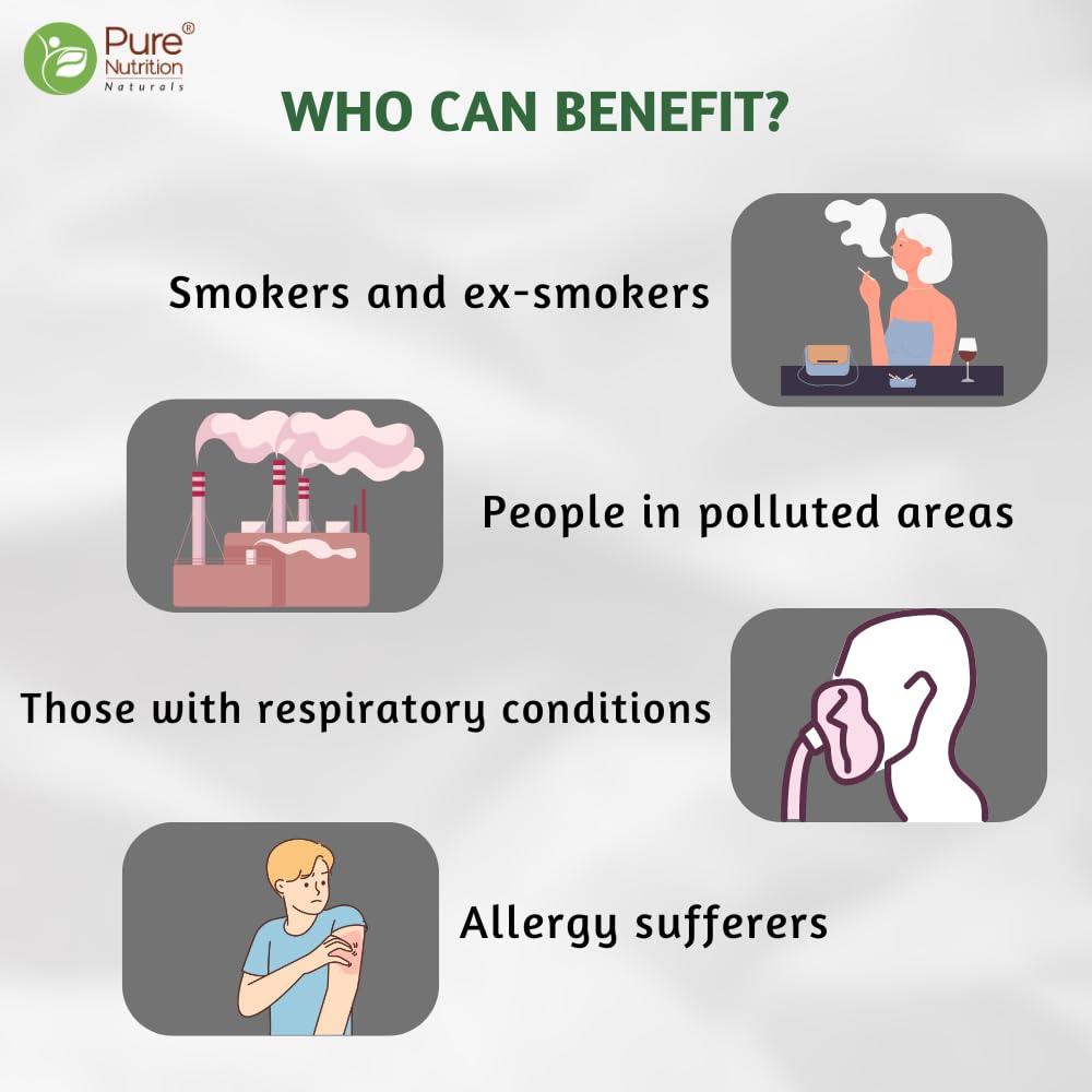 - It helps the respiratory system's healthy functioning by removing waste caused by smoking, pollution, and environmental toxins