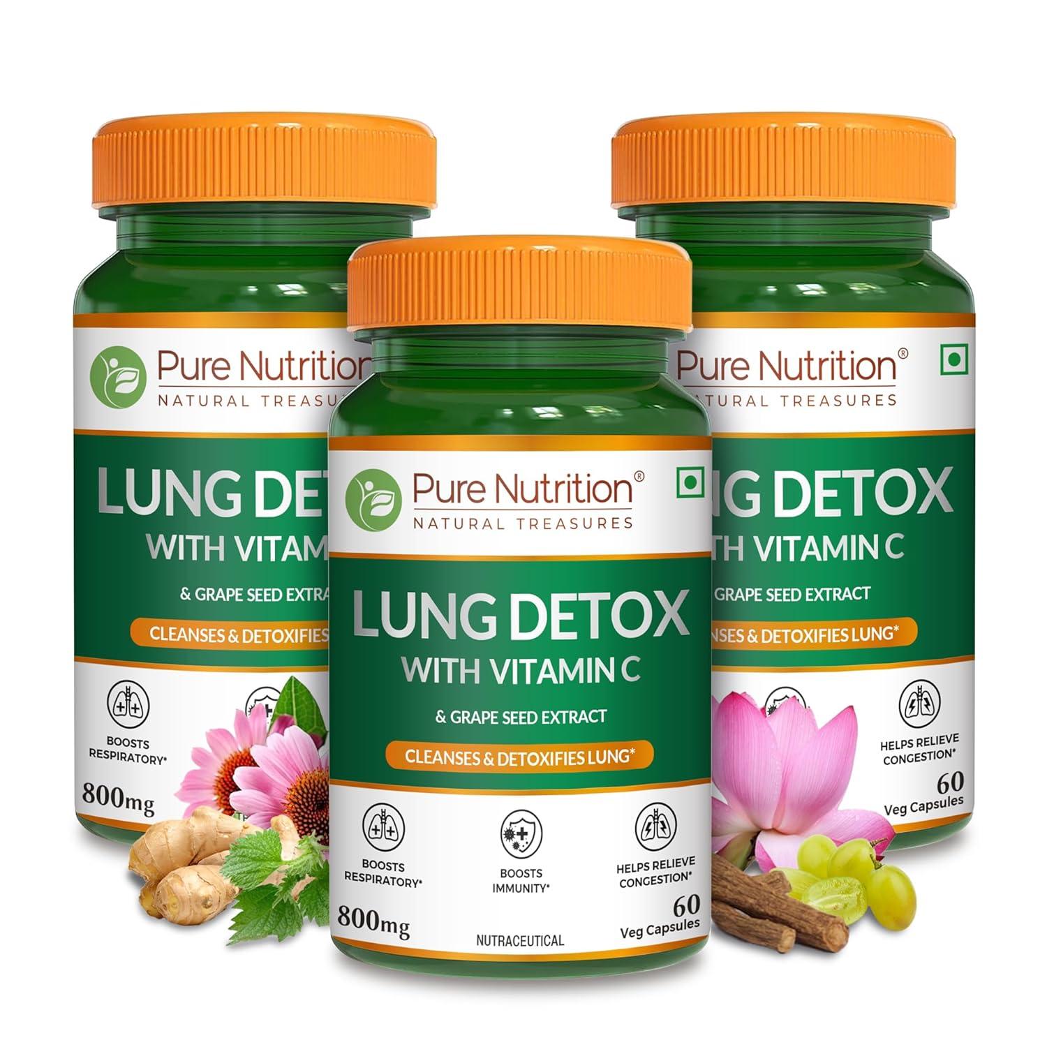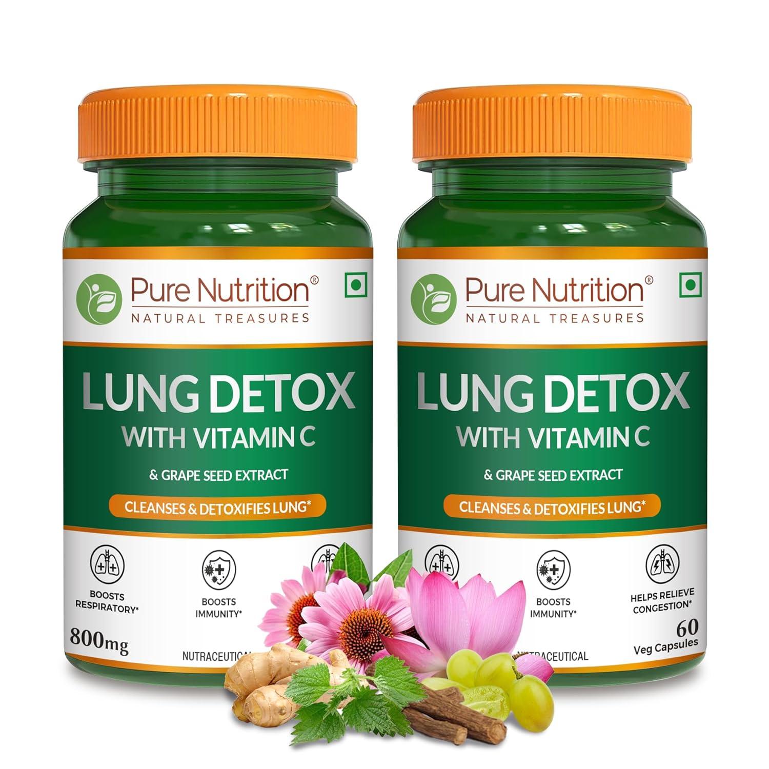 Pure Nutrition Lung Detox Capsule is a dietary supplement formulated with vitamin C, grape seed extract, vasaka leaves extract, and stinging nettle leaves extract that promotes your general well-being. These natural ingredients are high in virucidal and antioxidant properties, which help support lung functions. It helps the respiratory system's healthy functioning by removing waste caused by smoking, pollution, and environmental toxins.