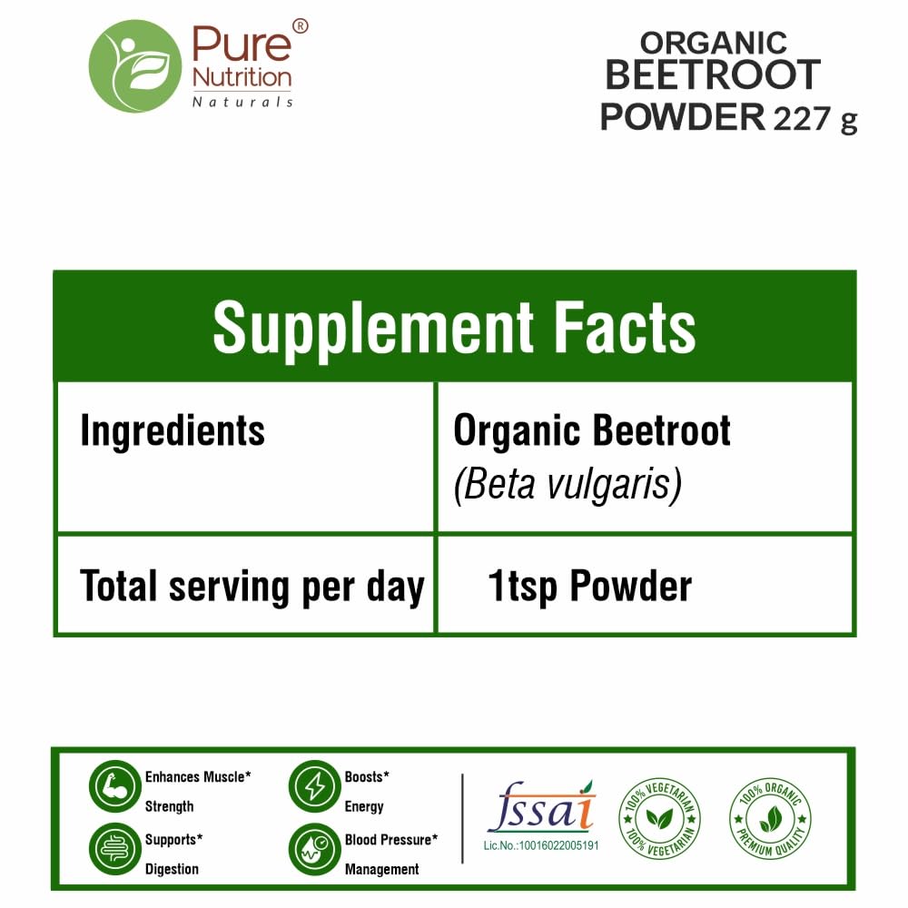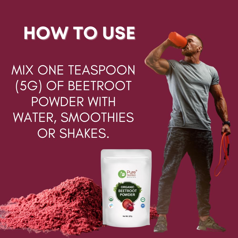 Pure Nutrition Organic Beetroot Powder is a versatile and nutrient-rich product made from high-quality beetroots. Its natural flavor and vibrant color make it perfect for adding to smoothies, juices, baked goods, or savory dishes. This powder supports daily nutrition and may help you stay energized and active. Whether you're starting your wellness journey or looking to complement your healthy lifestyle, Organic Beetroot Powder is a convenient and wholesome choice. Rich in essential nutrients like iron, potassium, and magnesium, beetroot powder contributes to overall health. Its high nitrate content supports blood flow and oxygen delivery, potentially enhancing athletic performance and endurance. Incorporating beetroot powder into your diet can also benefit skin and hair health. The antioxidants and anti-inflammatory properties in beetroot powder may help in reducing oxidative stress, promoting a healthy complexion, and supporting hair vitality. For those seeking natural skincare solutions, beetroot powder can be used in DIY face masks to help brighten the skin and reduce pigmentation. Similarly, it can be incorporated into hair care routines to support scalp health. Choosing organic beetroot powder ensures you're getting a product free from synthetic additives, aligning with a clean and health-conscious lifestyle.