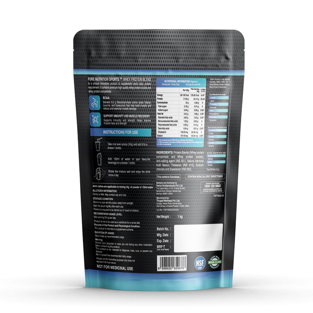 Pure Nutrition Whey Protein Blend is made from natural ingredients and contains a blend of both Whey Protein Isolate and Whey Protein Concentrate. The protein powder supports your body's needs for more energy, stamina, lean muscle mass gain, and quick recovery. This protein powder is devoid of contaminants and artificial substances. In addition, it contains 5.5 g BCAA, which helps avoid muscle wastage and 24 grams of protein per scoop.