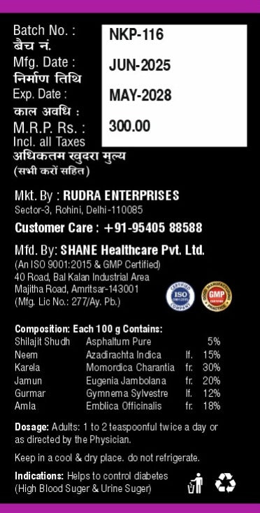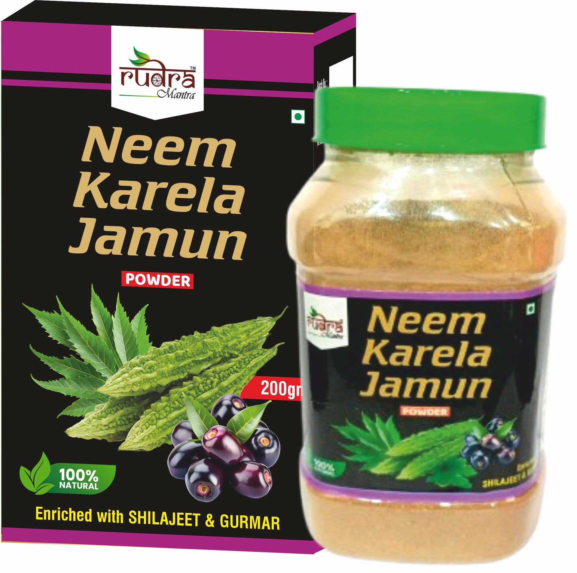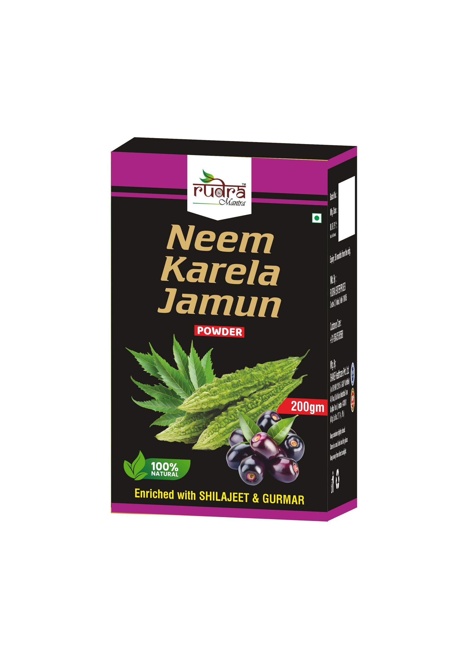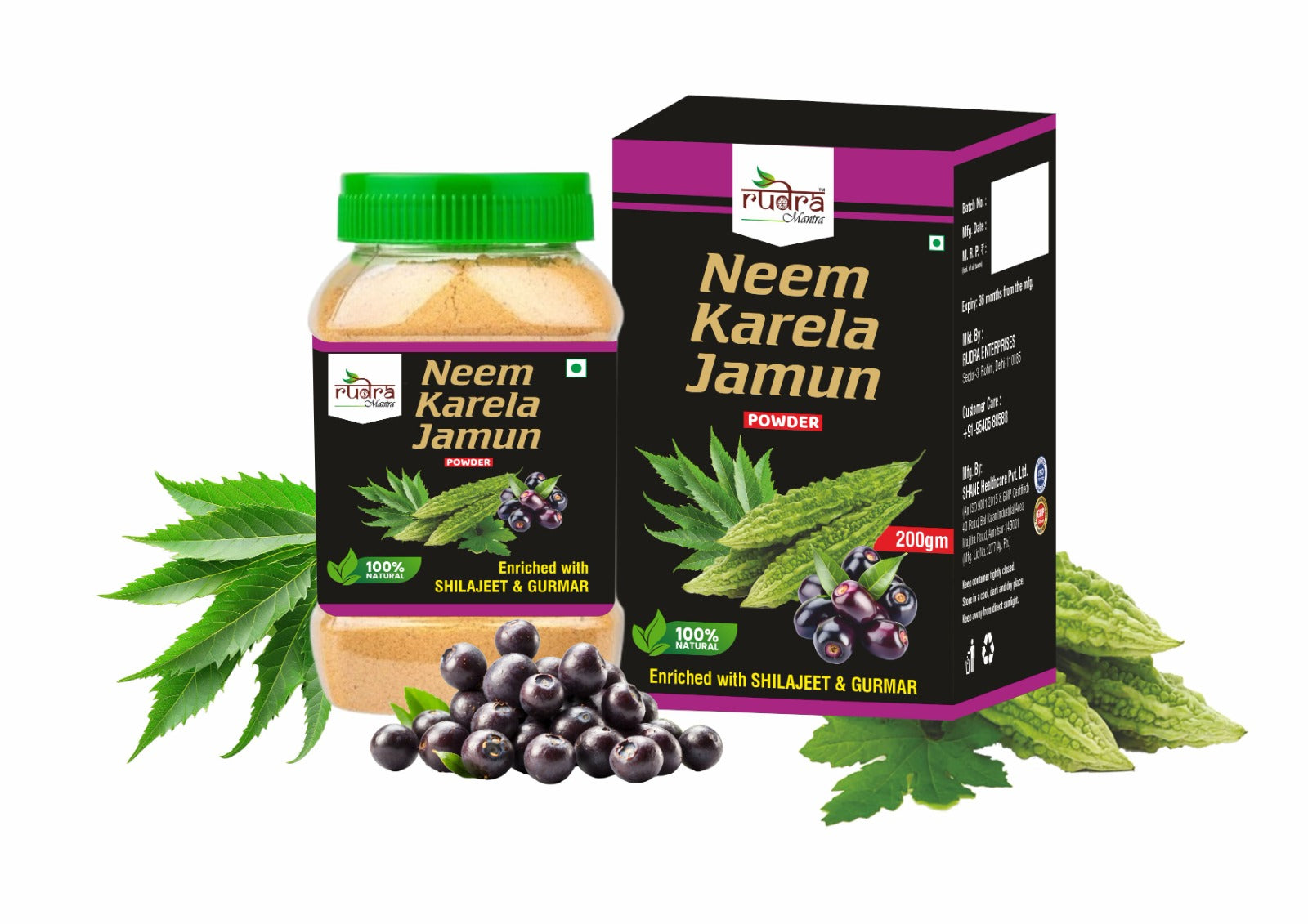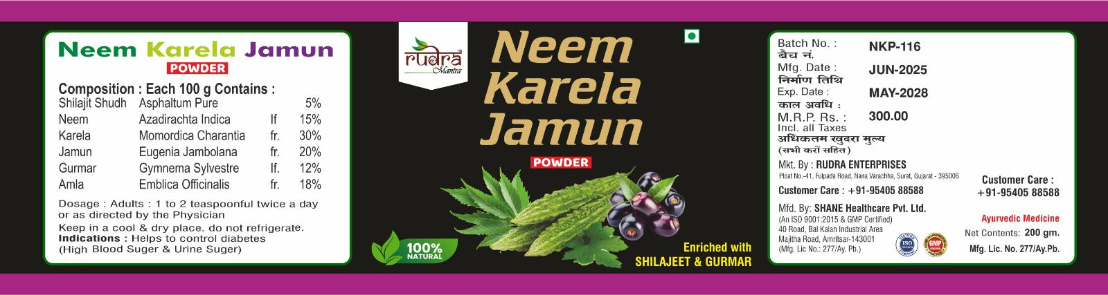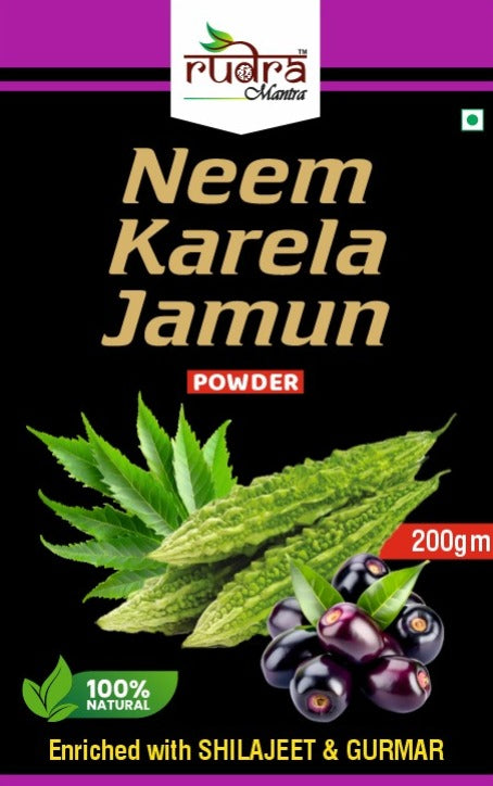 Rudra Mantra brings you a powerful herbal blend of Neem, Karela (Bitter Gourd), and Jamun (Indian Blackberry) — time-tested Ayurvedic ingredients known for their effectiveness in managing blood sugar levels. This 100% natural powder is enriched with Shilajit and Gurmar, which are renowned for their rejuvenating and sugar-controlling properties.
