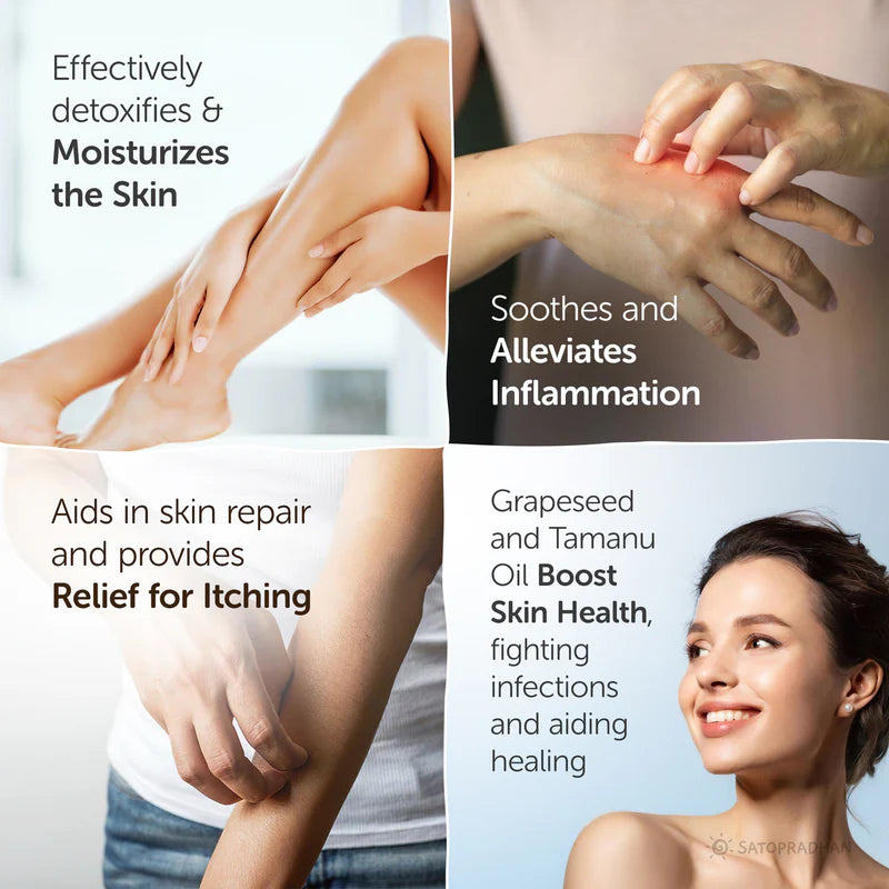 - Grapeseed and Tamanu Oil enhance skin health, fight bacterial infections, and accelerate healing.