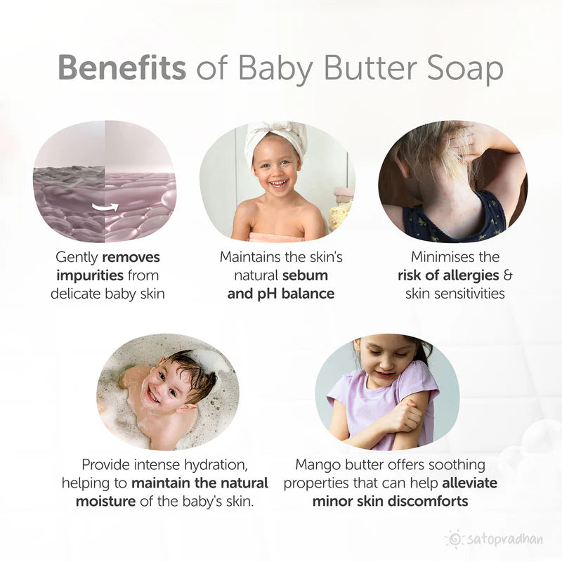 Satopradhan Moisturising Baby Soap - Specially handmade with enriching natural butter and cold-pressed oils to nurture sensitive and delicate baby-like skin. Formulated with natural fragrance, it's designed to prevent skin irritations and allergies, ensuring your little one's comfort and happiness.