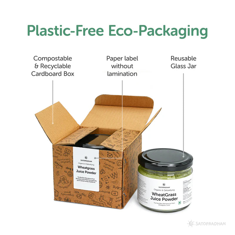 Satopradhan Wheatgrass Juice Powder - Revitalise your body with the detoxifying power of our wheatgrass juice powder - the next best alternative to fresh wheatgrass juice. Made from organically grown Sharbati variety wheatberries. These wheatberries are sprouted and harvested on the seventh day when their nutritional value peaks. The juice is then carefully extracted and dried to create a concentrated form. Our wheatgrass juice powder is more nutritious than conventional wheatgrass powder.