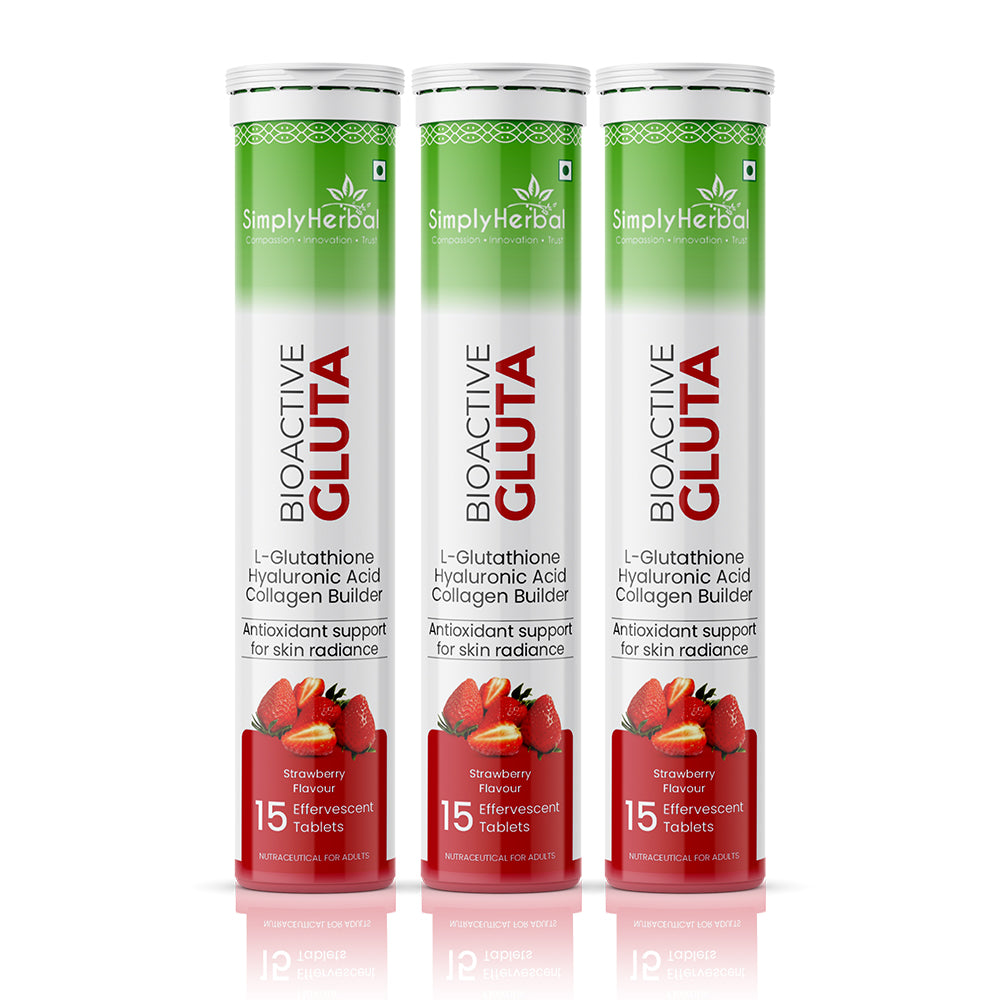 - Simply Herbal Bioactive Gluta Effervescent Tablets, Strawberry Flavoured with L-Glutathione, Hyaluronic Acid and Collagen Builder, 15 Tablets