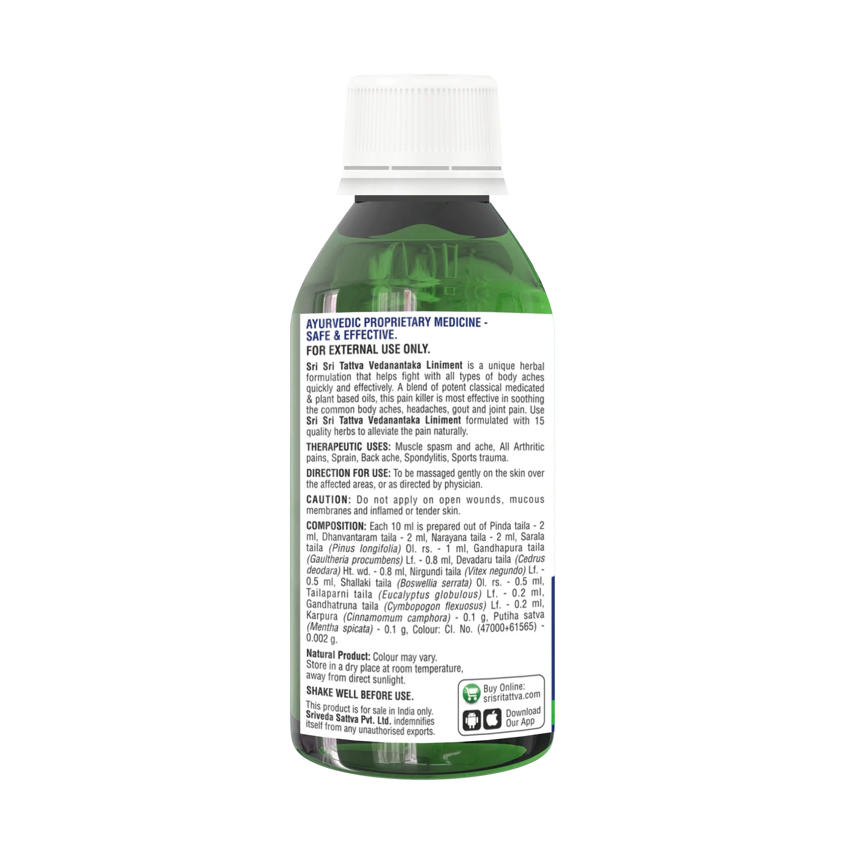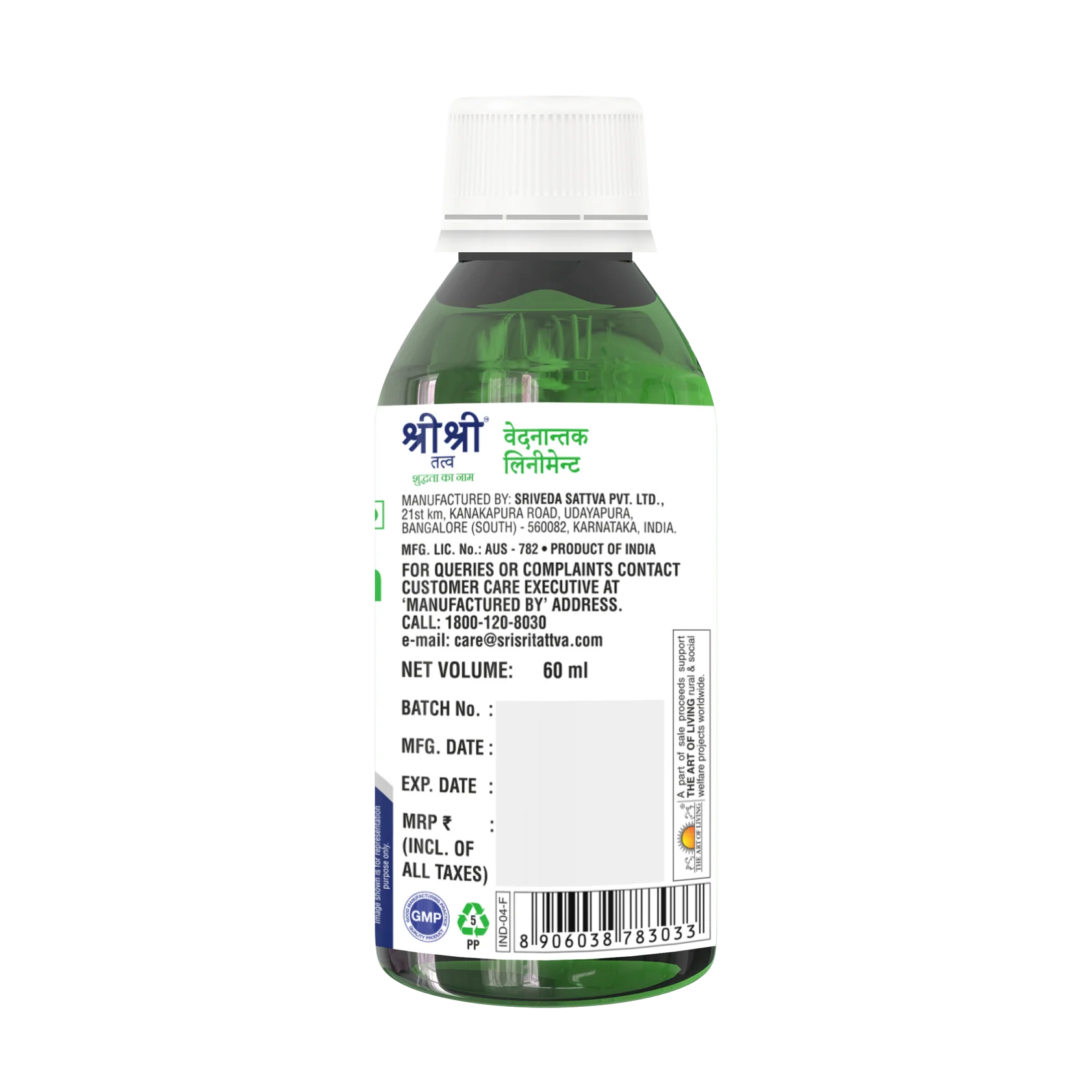 Sri Sri Tattva Vedanantaka Liniment contains 15 herbs as active ingredients. It helps in providing relief from various types of pain like mjuscle aches and joint pains.