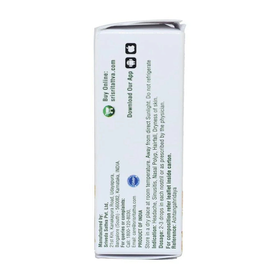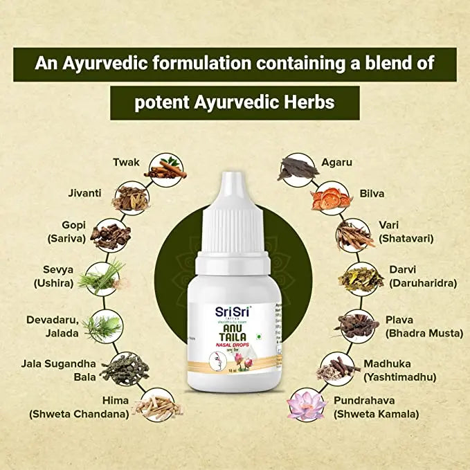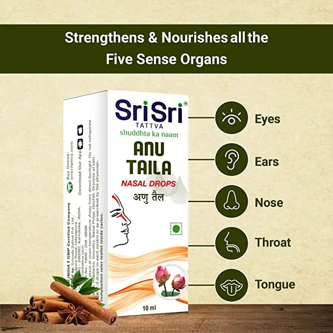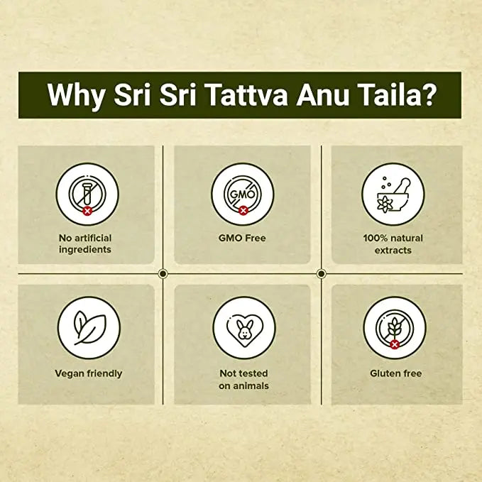 Sri Sri Tattva Anu Taila Nasal Drops is a herbal drop with a combination of herbs that nourishes and strengthens all the five sense organs - ears, eyes, nose, tongue and throat. It helps balance the Tridoshas and is useful in Vata, Pitta and Kapha imbalances. It is also helpful in balancing the hormone-producing glands in the head and neck area.
