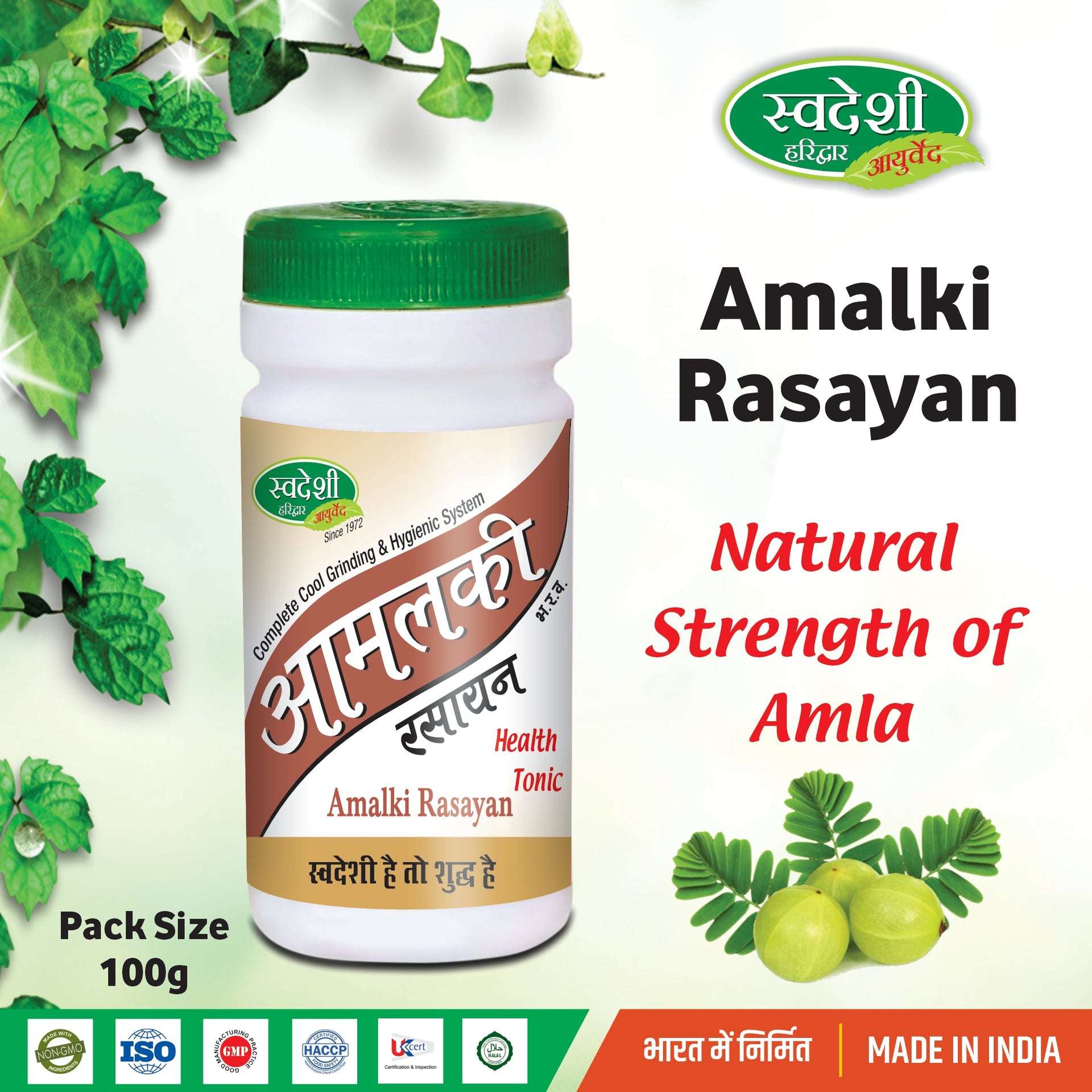 Swadeshi Amalki Rasyan is an Ayurvedic powder, prepared from Amla, and Amla Swaras. It is recommended to increase Vigor and Vitality.