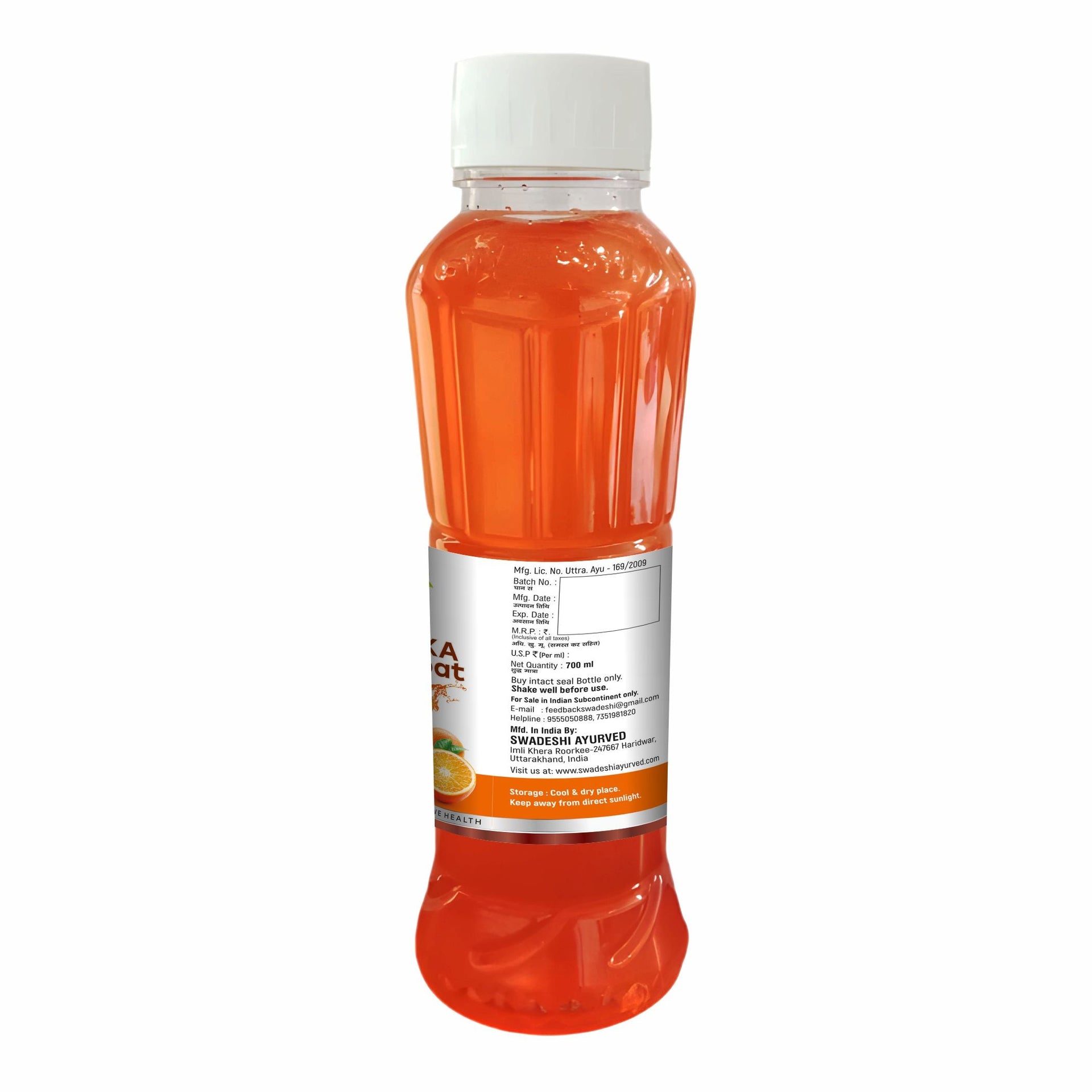 Swadeshi Ayurved Santra Sharbat is an Ayurvedic medicine that is primarily used for the treatment of boosting immunity. Vitamins, minerals and vital amino acids are all present in it. It supports better digestive system function and aids in the development of immunity against a variety of hazardous pollutants. It has good palatability and may be used to produce mocktails, cocktails, slush and fruit punches.