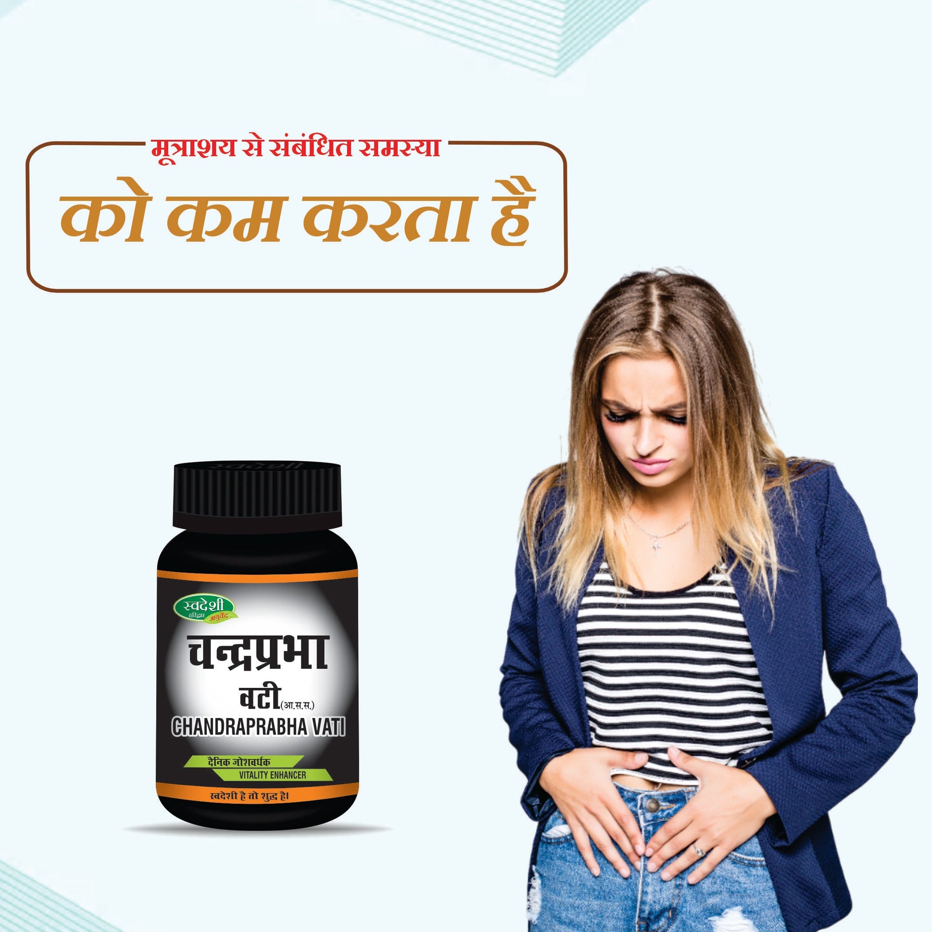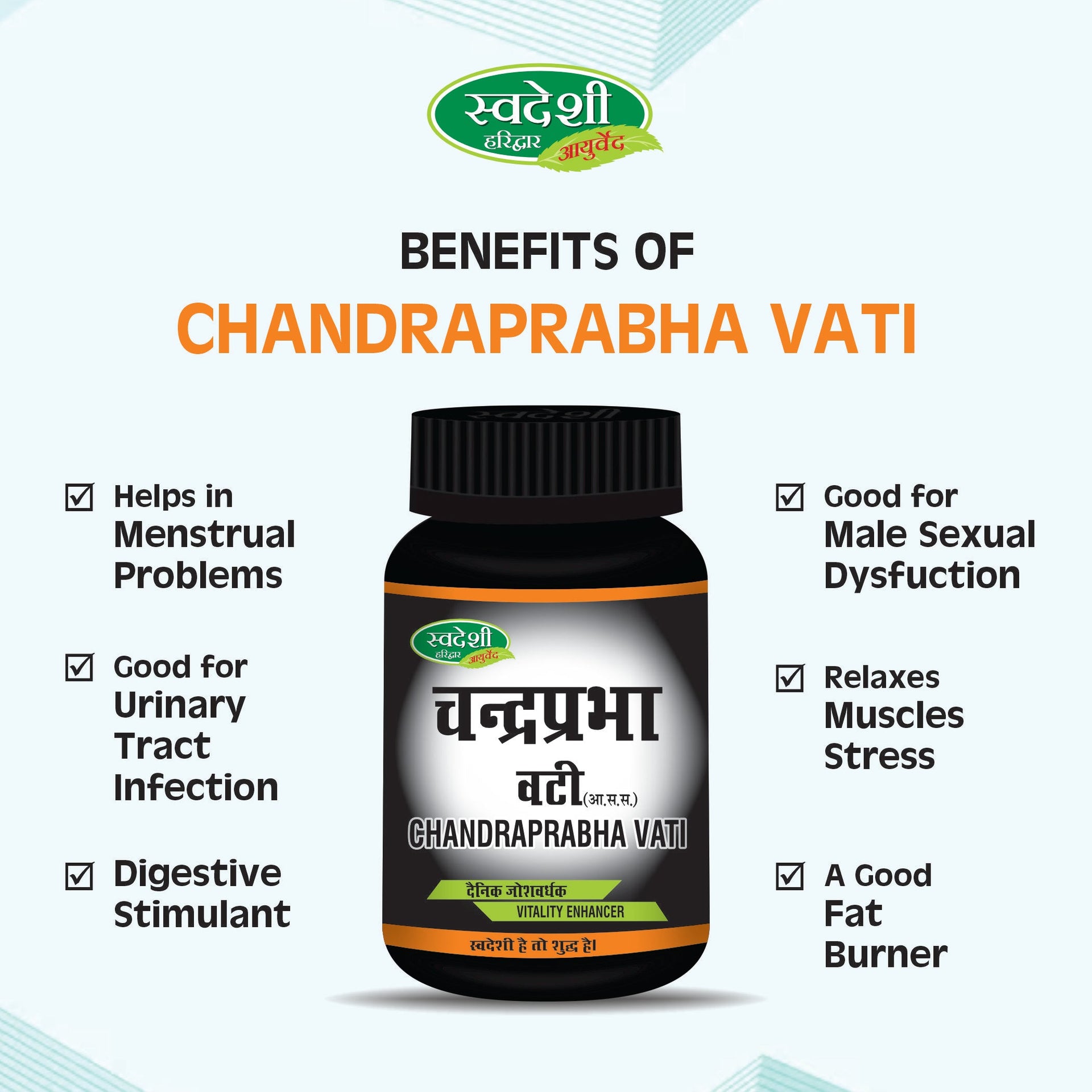 Swadeshi Chandraprabha Vati Powder is an Ayurvedic powder that contains Chandraprabha and several aromatic, medicinal and dietary herbs as active ingredients. It is used to treat urogenital disorders such as urinary tract infection, difficulty in urination, urinary calculi.