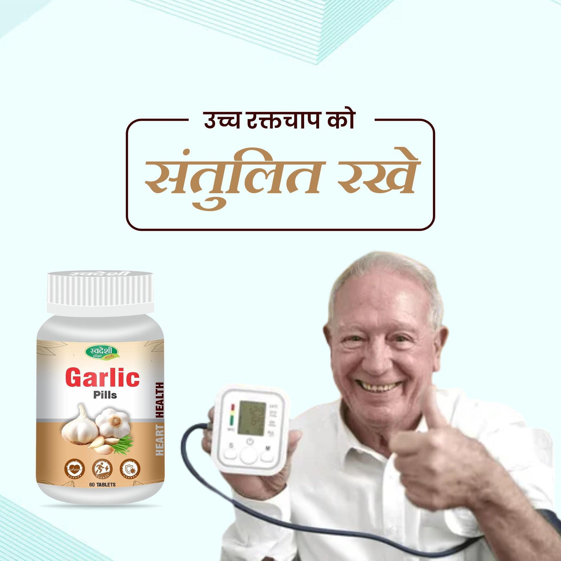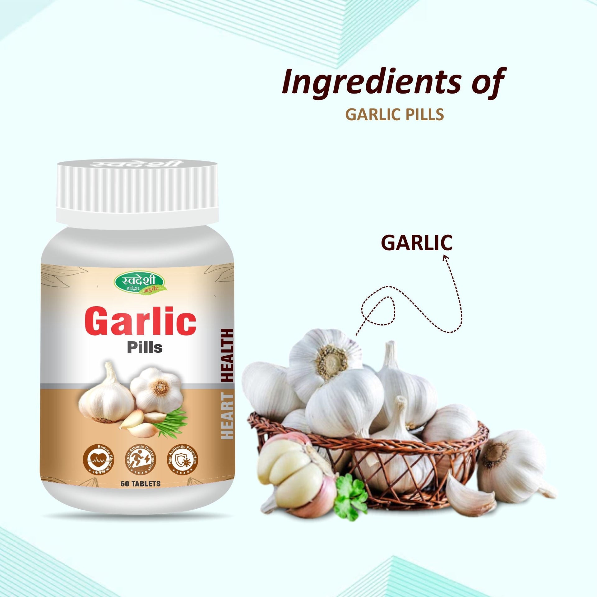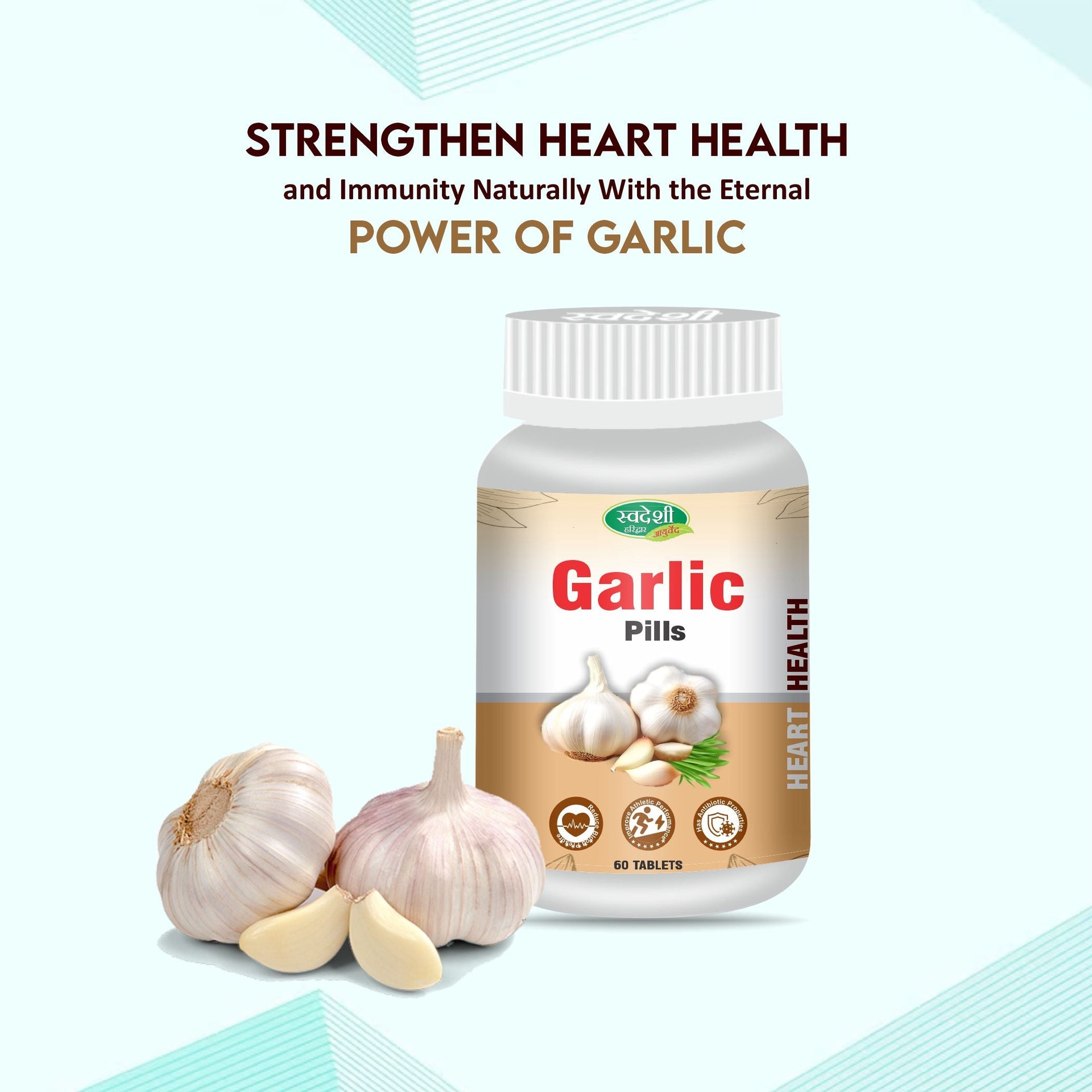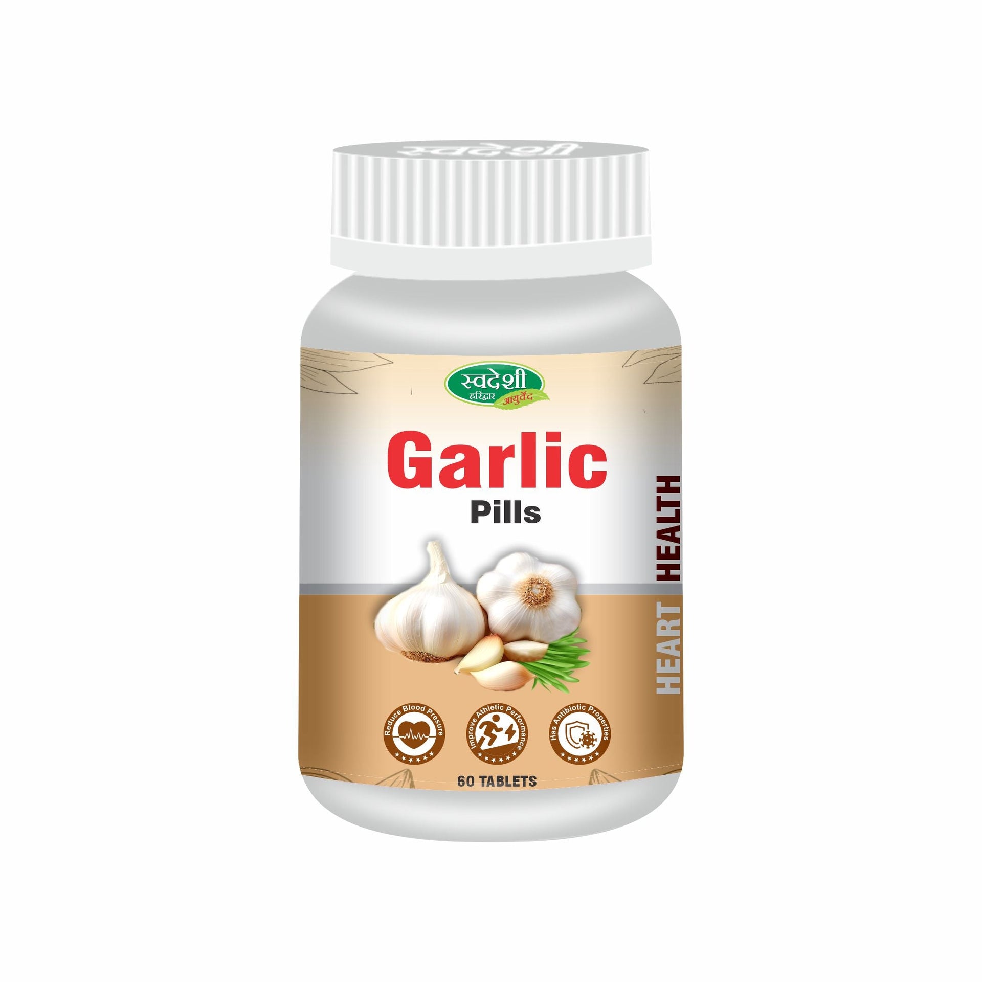 Swadeshi Garlic pills are a great dietary supplement meant to enhance the body's overall health. Allicin is the primary element of Garlic and it helps in improving blood lipid levels. Garlic has been used since ancient times as a supplement to improve heart health and has multiple health benefits.