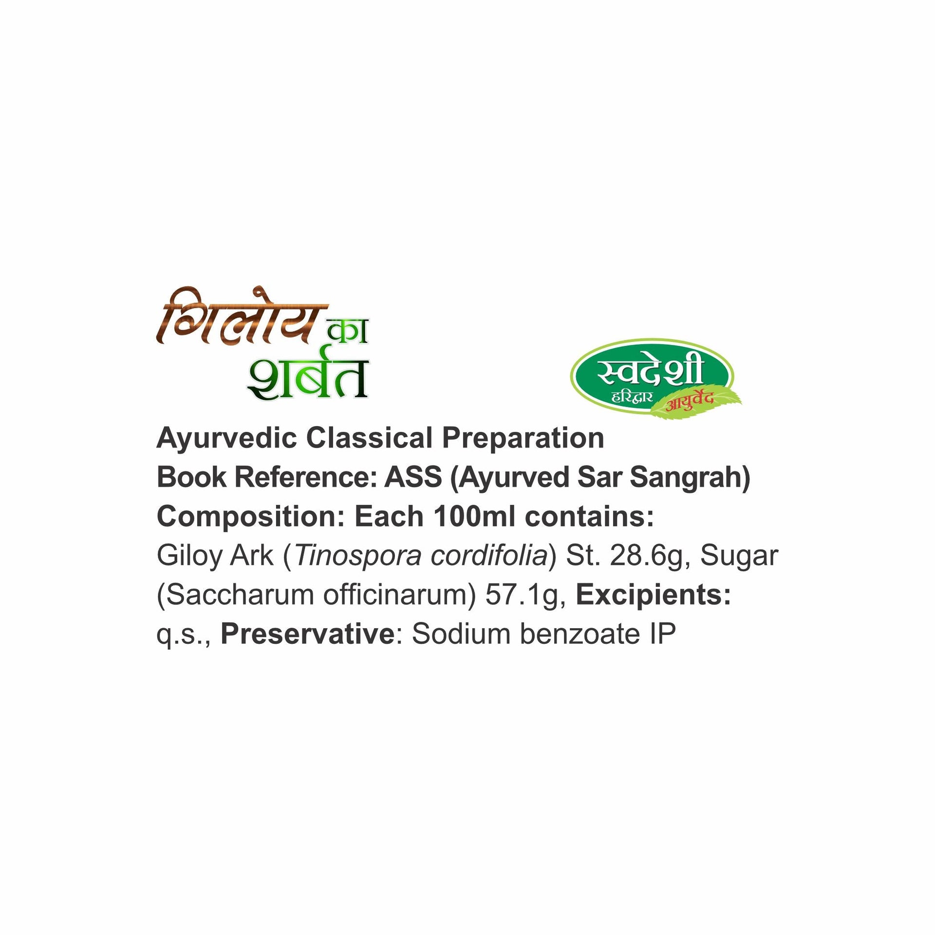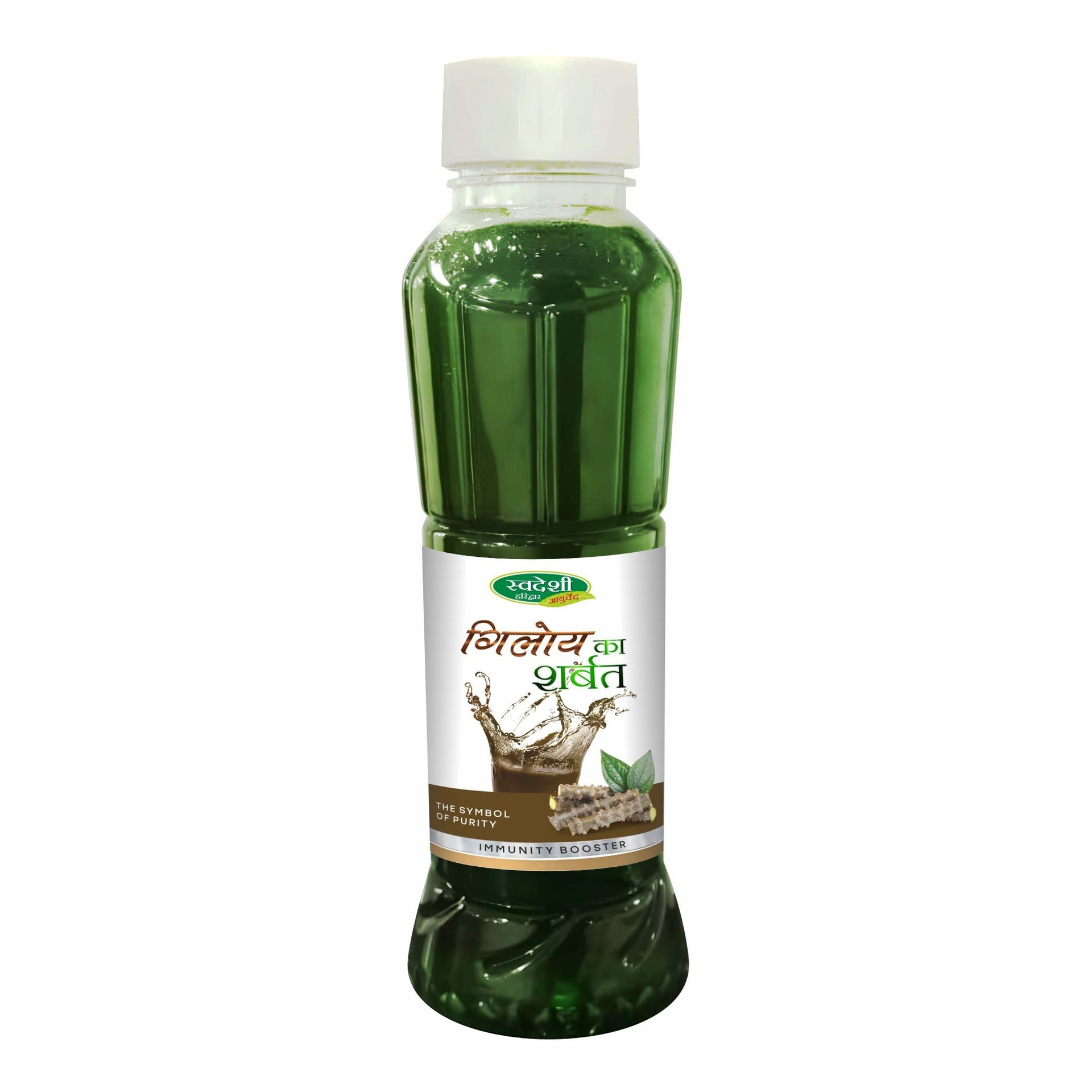 Swadeshi Giloy Sharbat is an ayurvedic sharbat which relieves heartburn, activates kidney and liver, and eliminates bile disorders. It is known to maintain balance in the tridoshas that is bile, air, and phlegm. It builds your immunity stronger and gives you a good night sleep. It treats symptoms as high uric acid in the blood and urinary irritations.