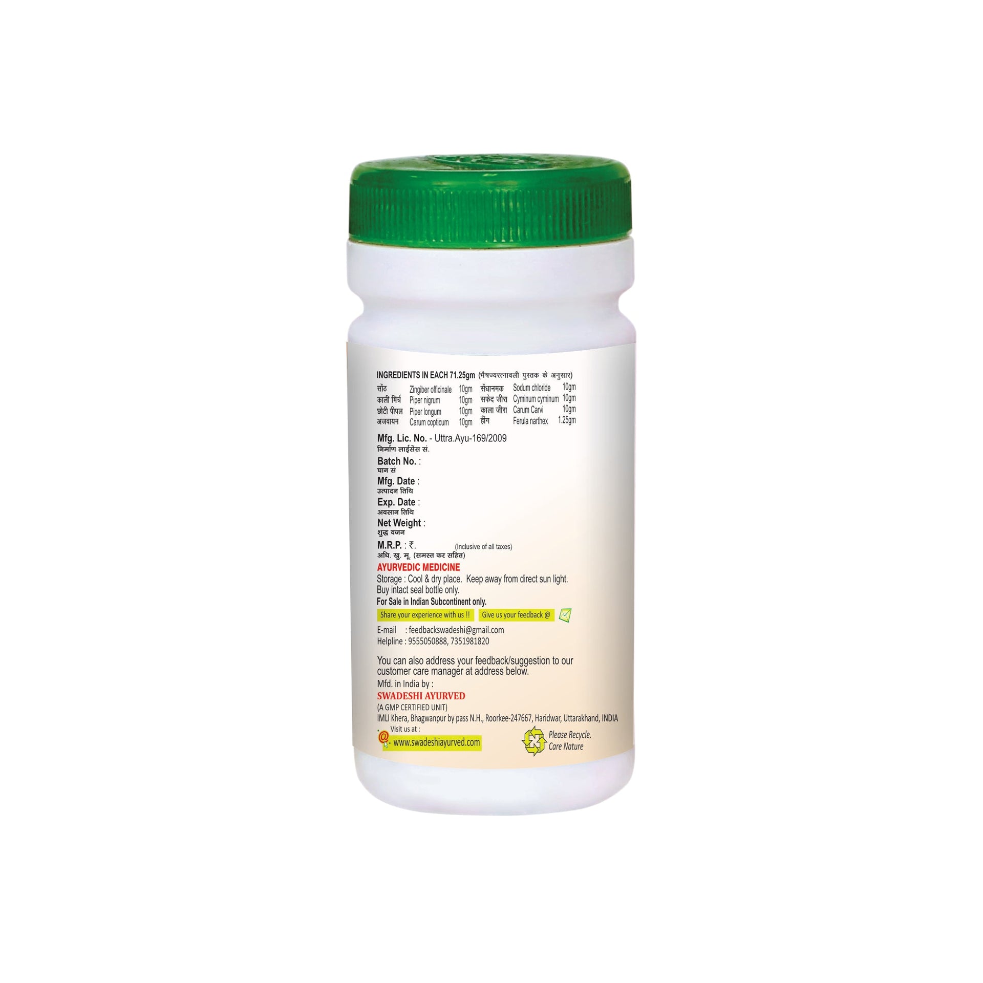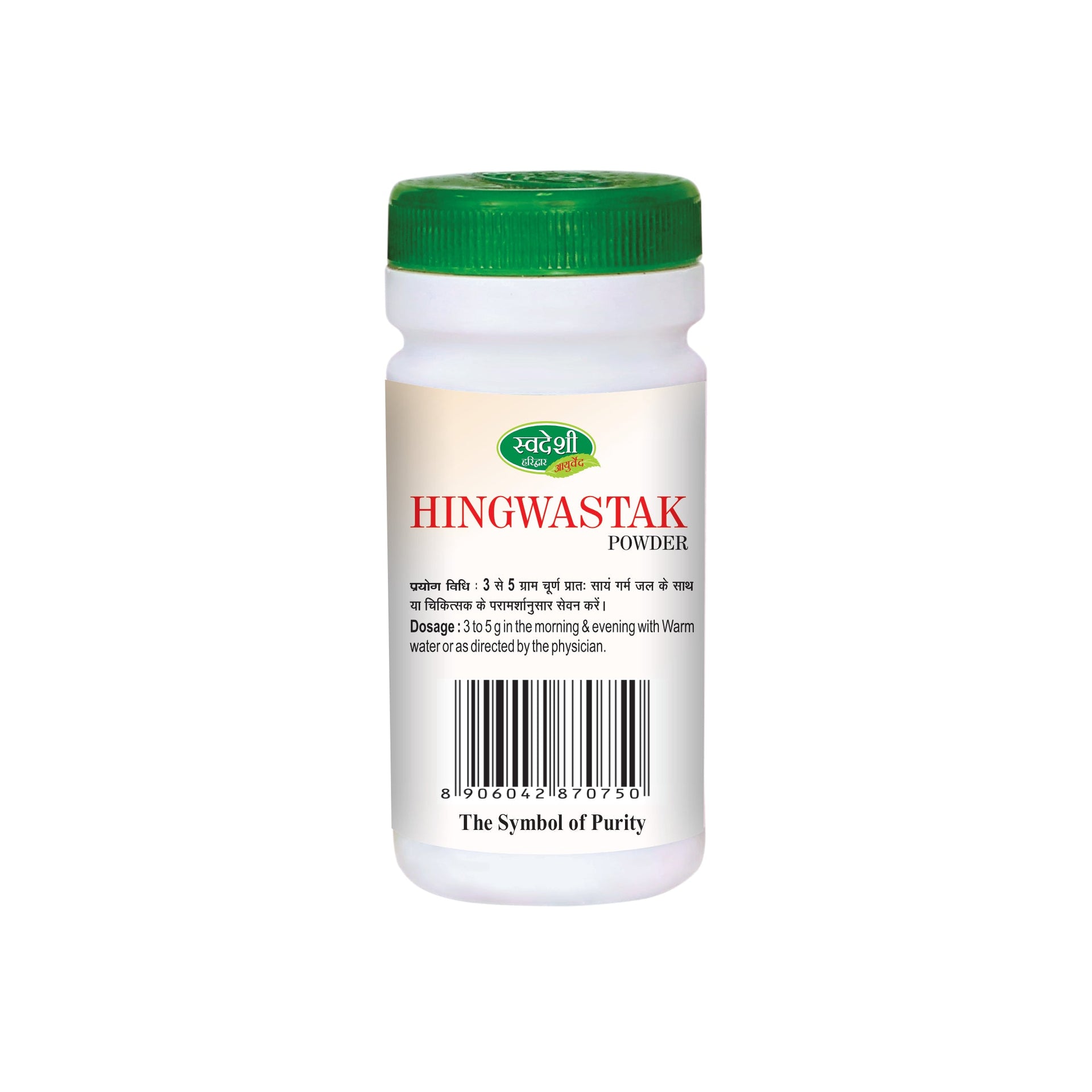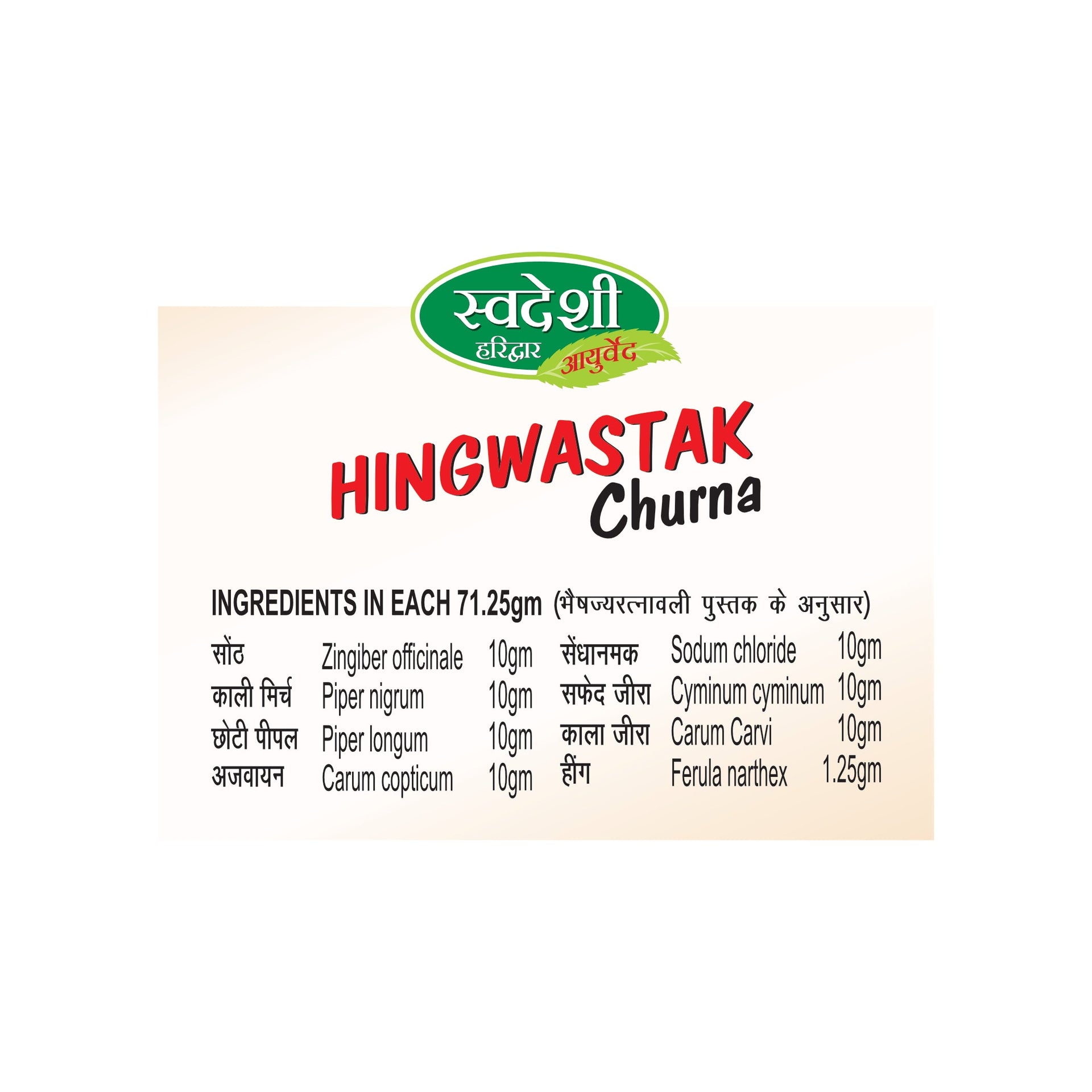 Swadeshi Hingwashtak Churna contains Sunthi, Maricha, Pippali, Ajamoda, Saindhava Namak, Kalajira, and Shuddha Hing as main active ingredients.
