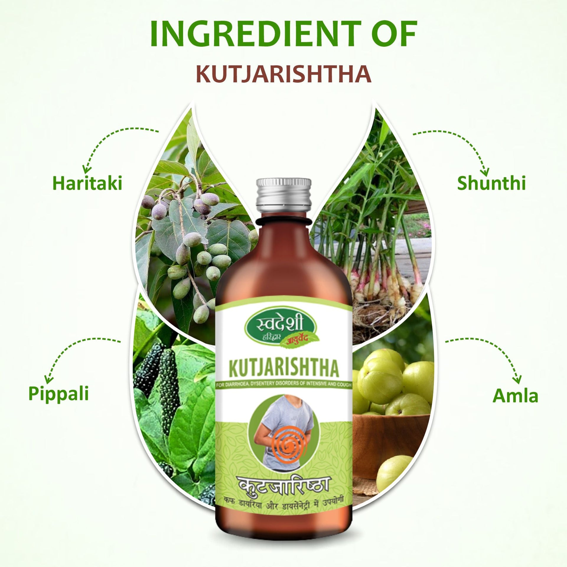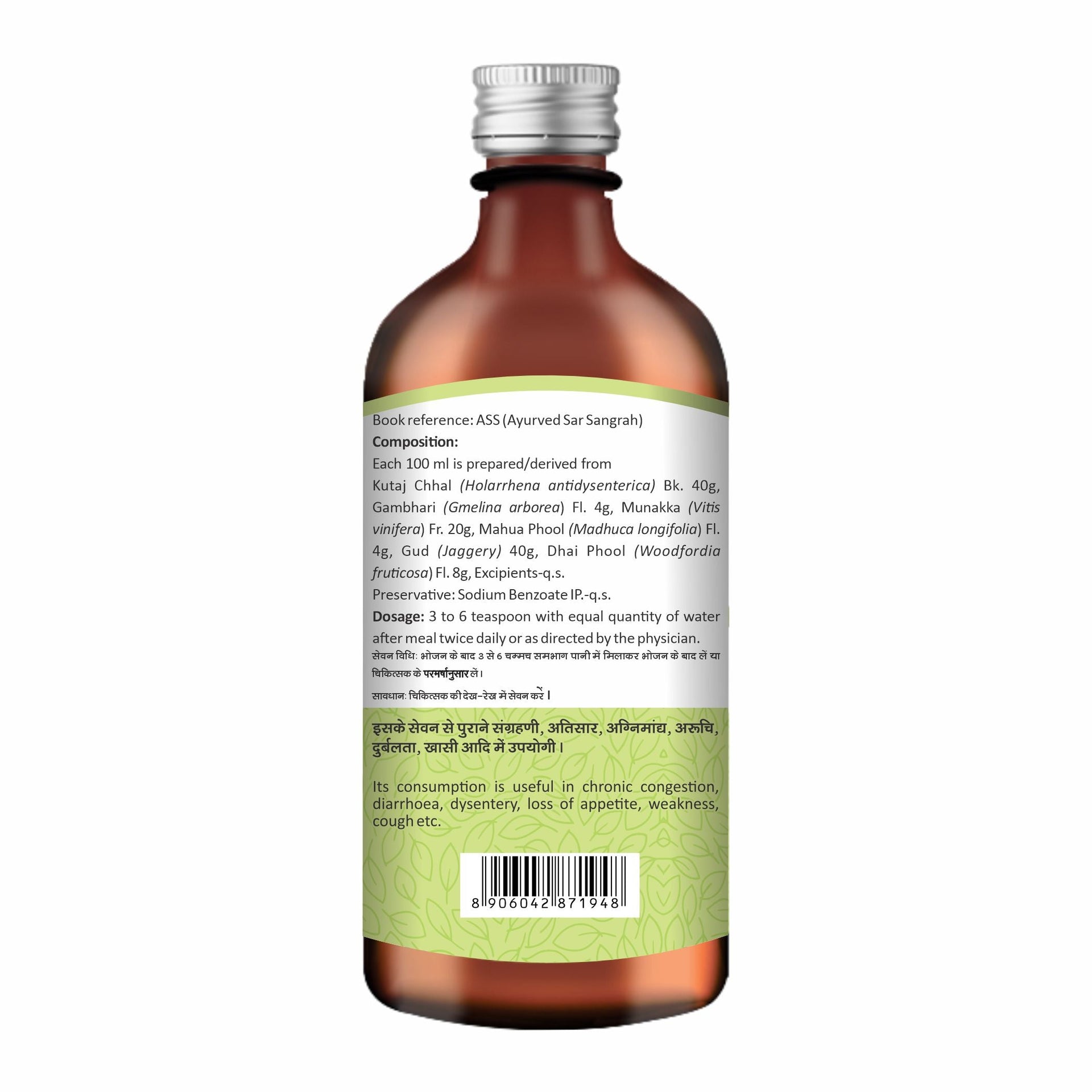 Help treat loose motions and bloody dysentery. Treats diarrhoea by reducing intestinal motility. Used for chronic fever. Also, helps in Bleeding Piles with the discharge of mucus. Kutajarishta improves digestion.