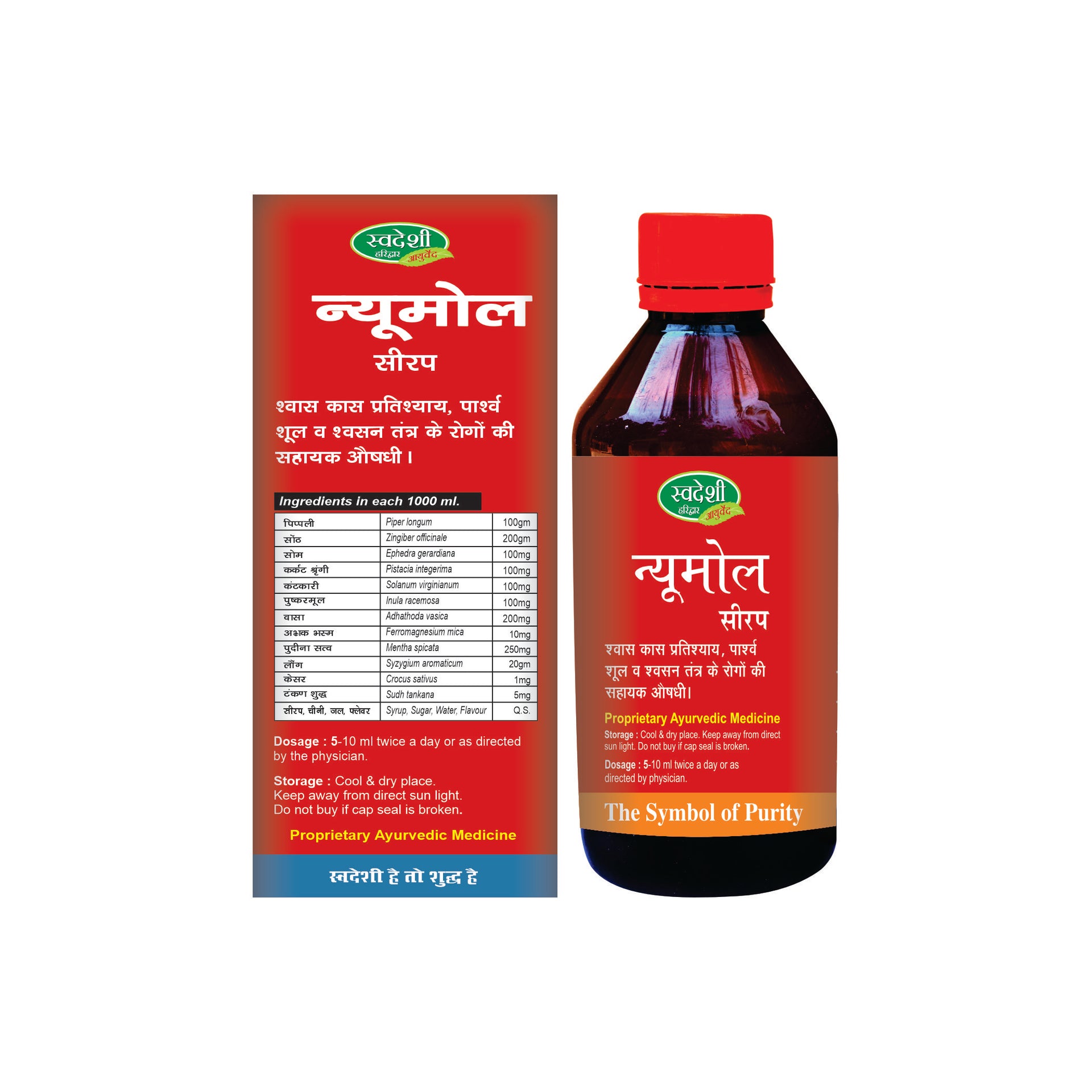 Swadeshi Neumol Syrup contains Pippali, Sonth, Soma, Kakrasringi, Pushkarmool, Vasa, Abhrak Bhasma, pudina Satv, Laung, Kesar, Sudh Tankan, and Chini as main active ingredient.