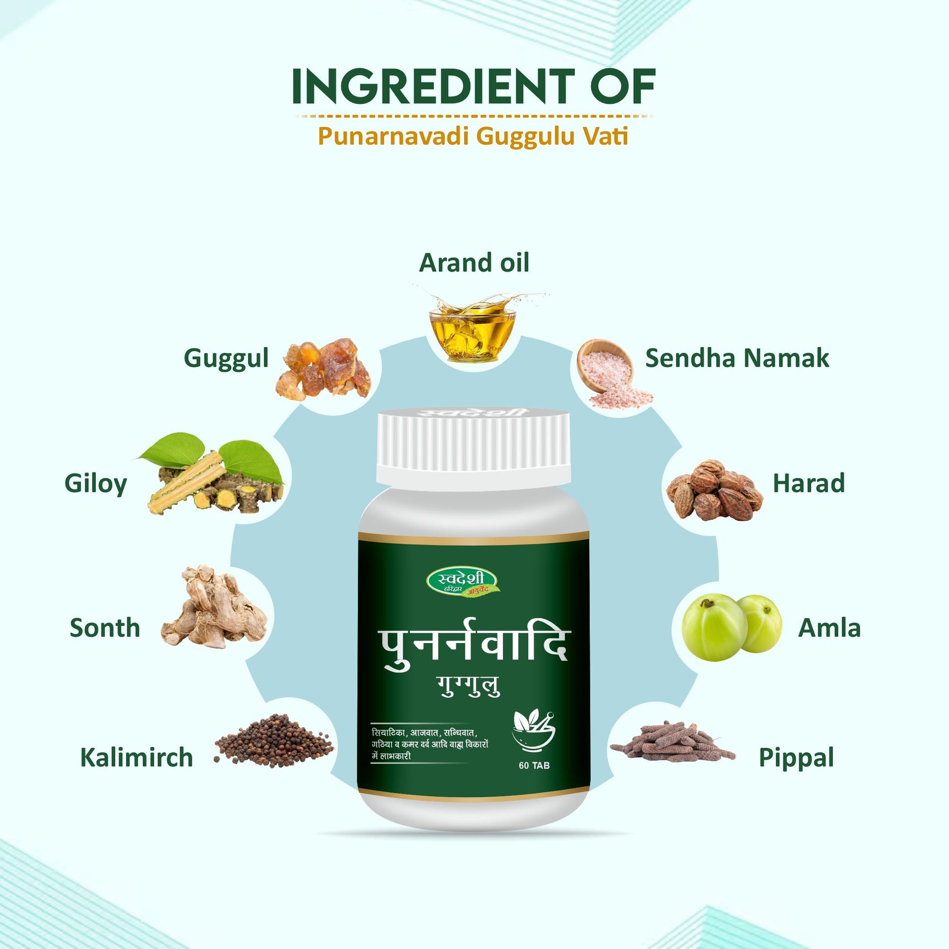 Swadeshi Punarnavadi Guggul contains Shudh Guggul, Arand Oil, Harad, Baheda, Amla, Sonth, Kali Mirch, Pippal, Chitrakmool, Nisoth, Dantimool, Giloy, Sendha Namak, Shudh Bhilava, Vaividang, Swarnmakshik as active ingredients.