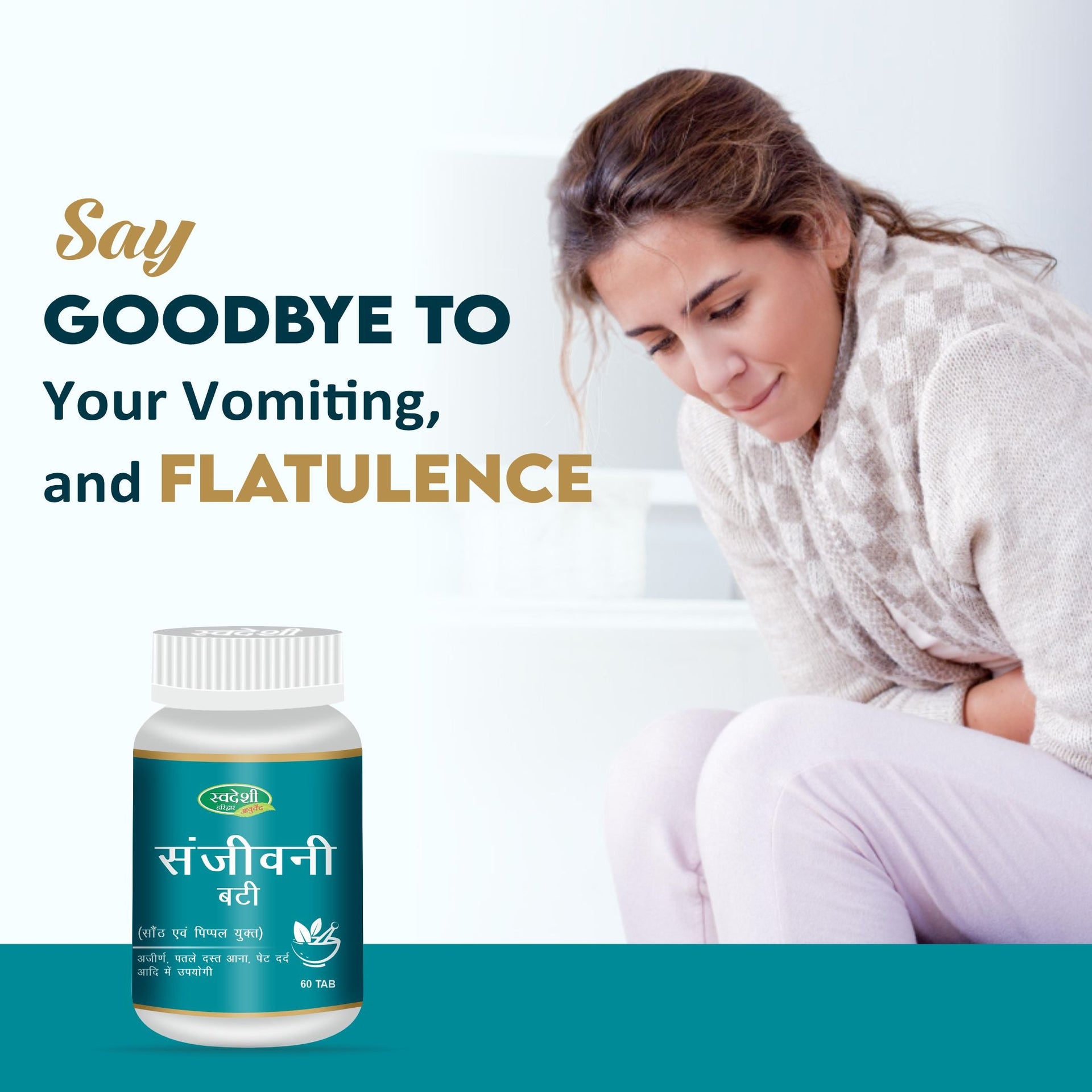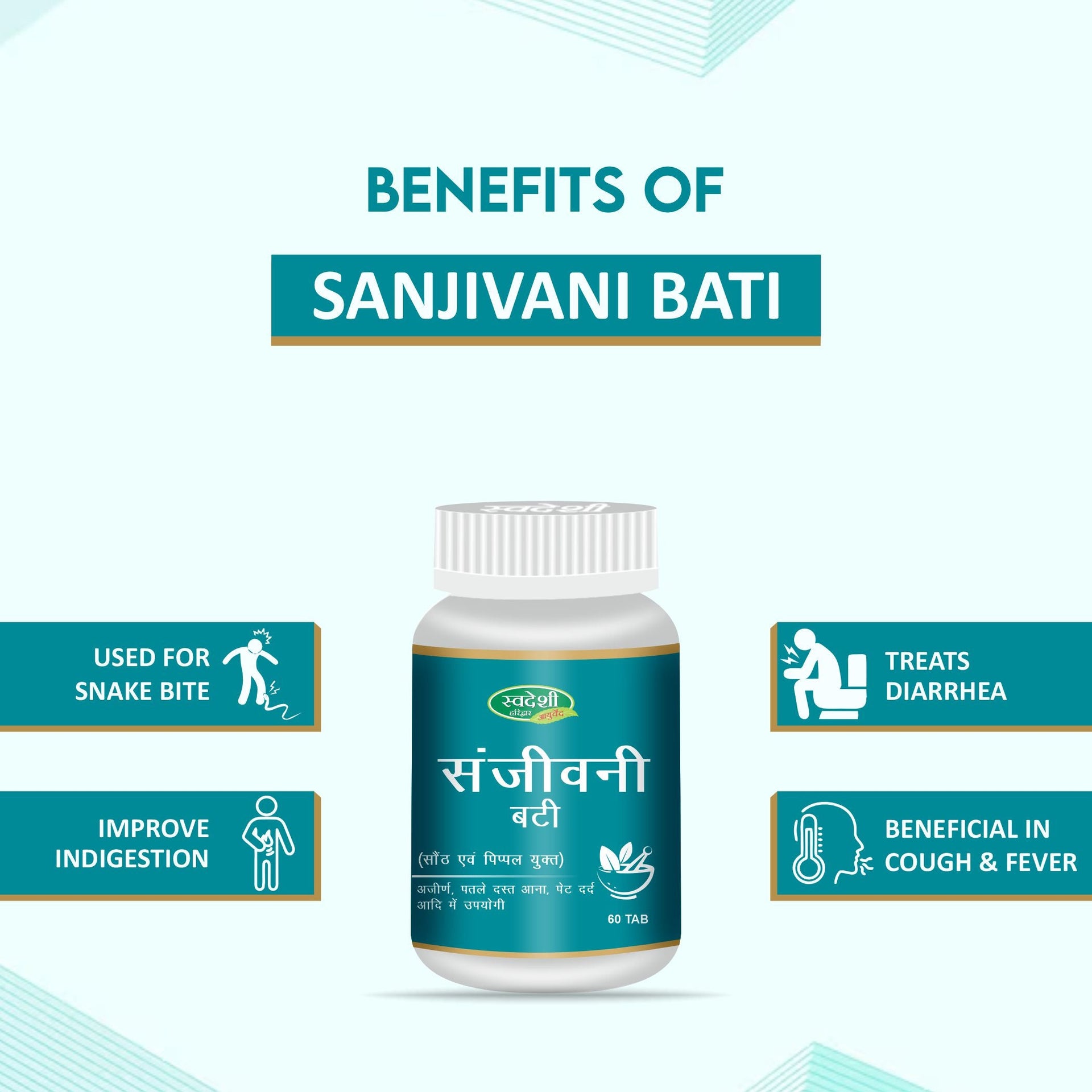 Swadeshi Sanjivani Vati has Javarghana (antipyretic) property which helps control fever. It also has Deepan (appetizer) and Pachan (digestive) properties which aid in improving digestion, controlling symptoms of indigestion and diarrhea. These properties may also aid in providing relief from the symptoms of rheumatoid arthritis-like joint pain and swelling. Sanjivani Vati also has Kapha balancing property which helps control cough, release mucus, clear air passages, thus aiding the patient to breathe freely.