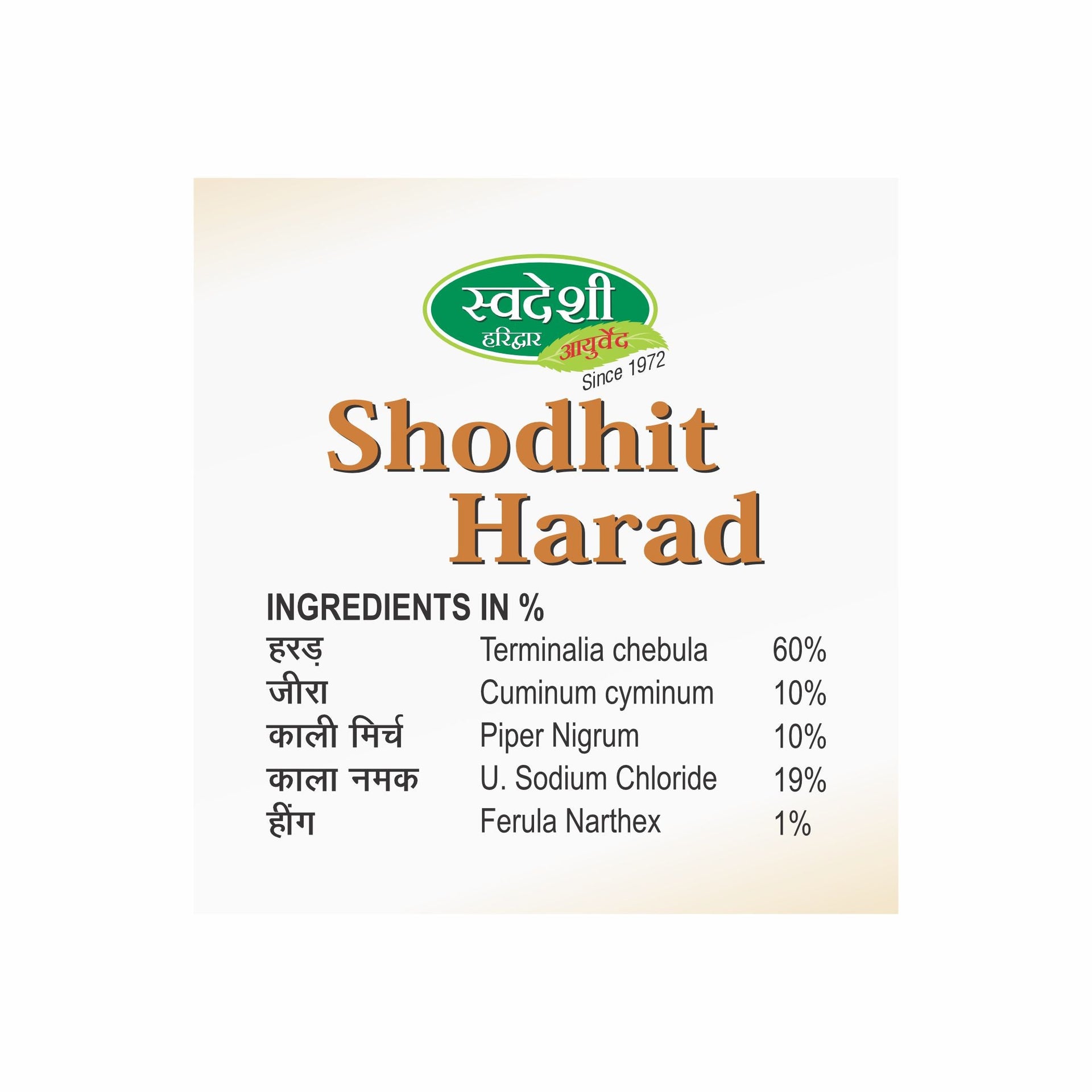 Swadeshi Shodhit Harad is made of harad, which is the name of the dried fruit of the Terminalia Chebula tree.
