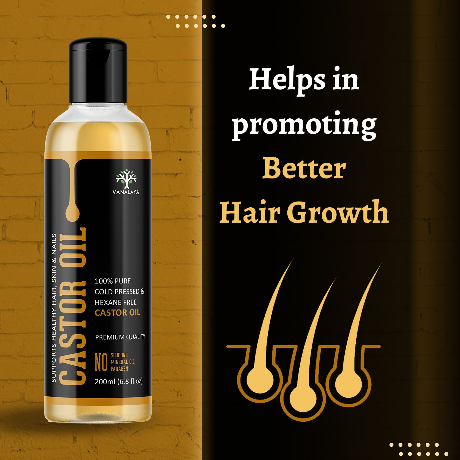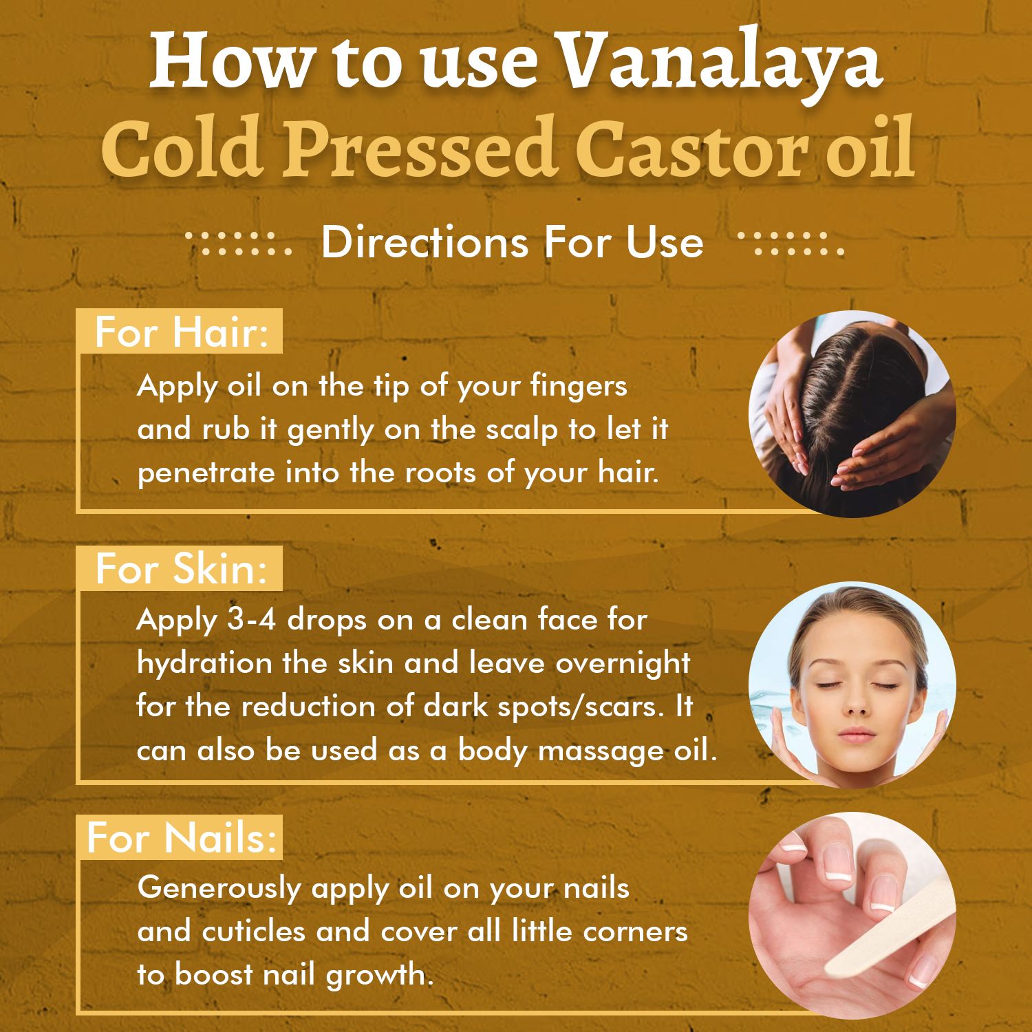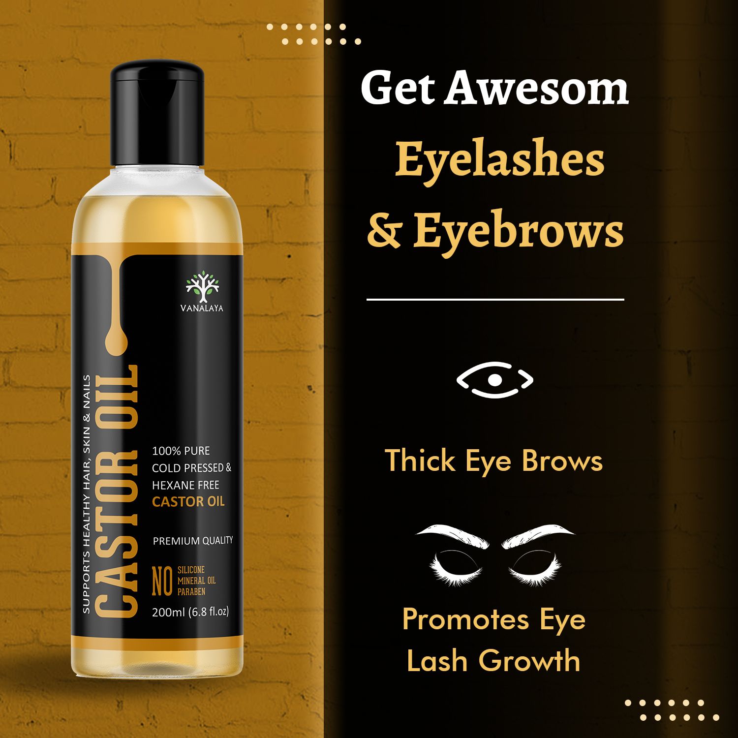 Vanalaya Castor Oil is organically grown and cold pressed with no added preservatives. Because it’s 100% pure, it easily absorbs into your lashes and brows to boost hair growth. Castor Oil helps grow longer and thicker hair in a quick, natural way, while also diminishing hair loss. It is also a natural hair treatment pack for dry brittle hair, dry scalps, and dandruff. Besides hair growth, Castor Oil is also great to use as a natural moisturizer and for skin health. It helps retain moistures so your skin doesn't get dry during the day. Castor Oil also helps your nails grow longer and stronger. If you have dry cuticles, this oil will help your fingers moisturize, especially during the harsh winter season.