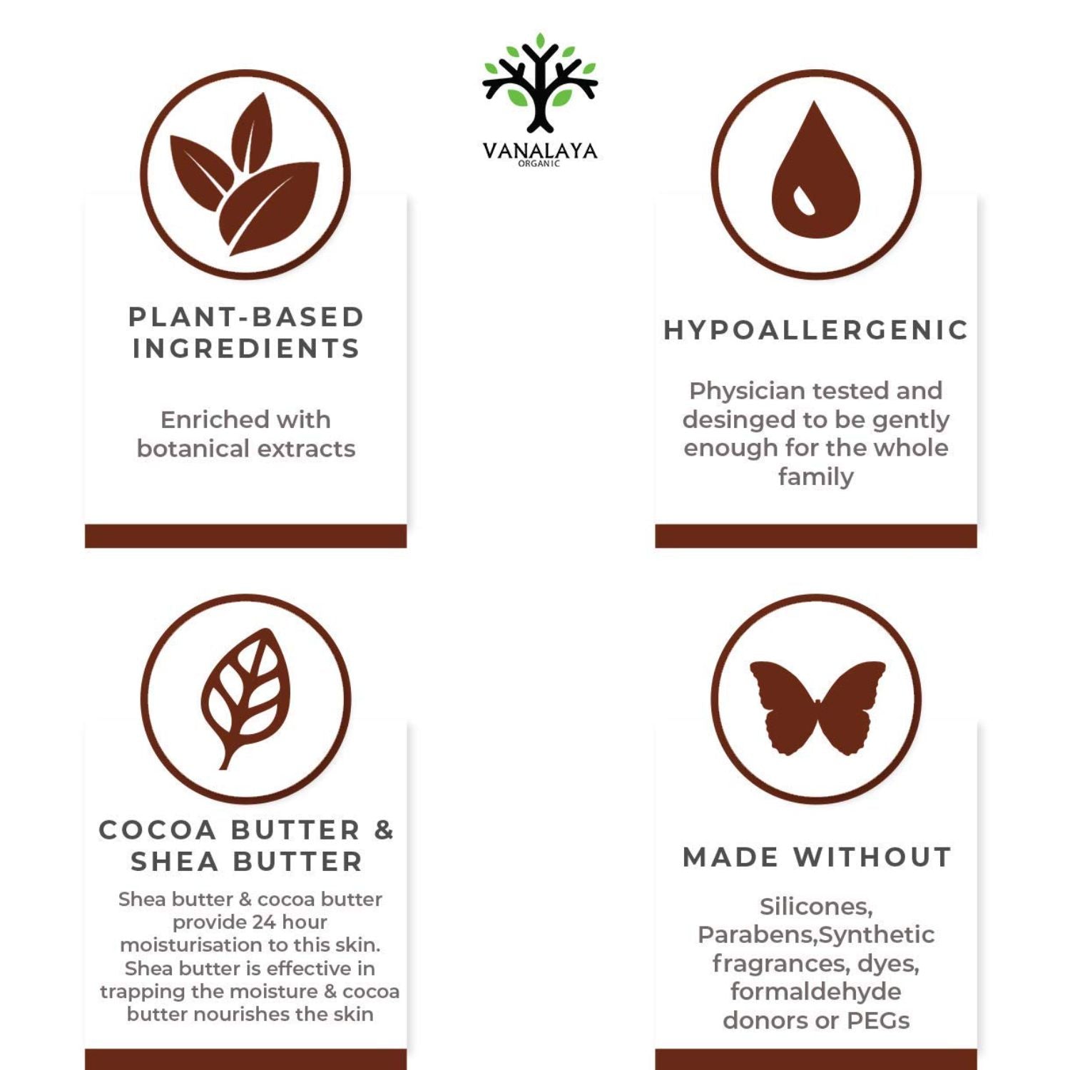 Vanalaya Cocoa Butter & Shea Butter Moisturizing Lotion contains 7 natural raw ingredients, including shea butter, aloe vera, coconut oil, almond oil, wheat germ oil, olive oil, and coconut butter, enhanced with tea tree oil will hydrate your skin, giving you a soft, smooth, and firm look. We use organic and natural active botanicals, pure plant oils, vitamins, and minerals that are safe and gentle and clinically proven to nourish and revitalize skin, leaving it looking younger and feeling healthier. Our products help rejuvenate your skin at a cellular level to repair wrinkles, reduce inflammation, and heal damage caused by age and the environment. They hydrate the skin and leave a protective barrier to keep moisture in and free radicals and pollutants out. Our 100% vegetarian formula is hypoallergenic and does not contain any parabens, phthalates or synthetic fragrances. It is also not tested on animals
