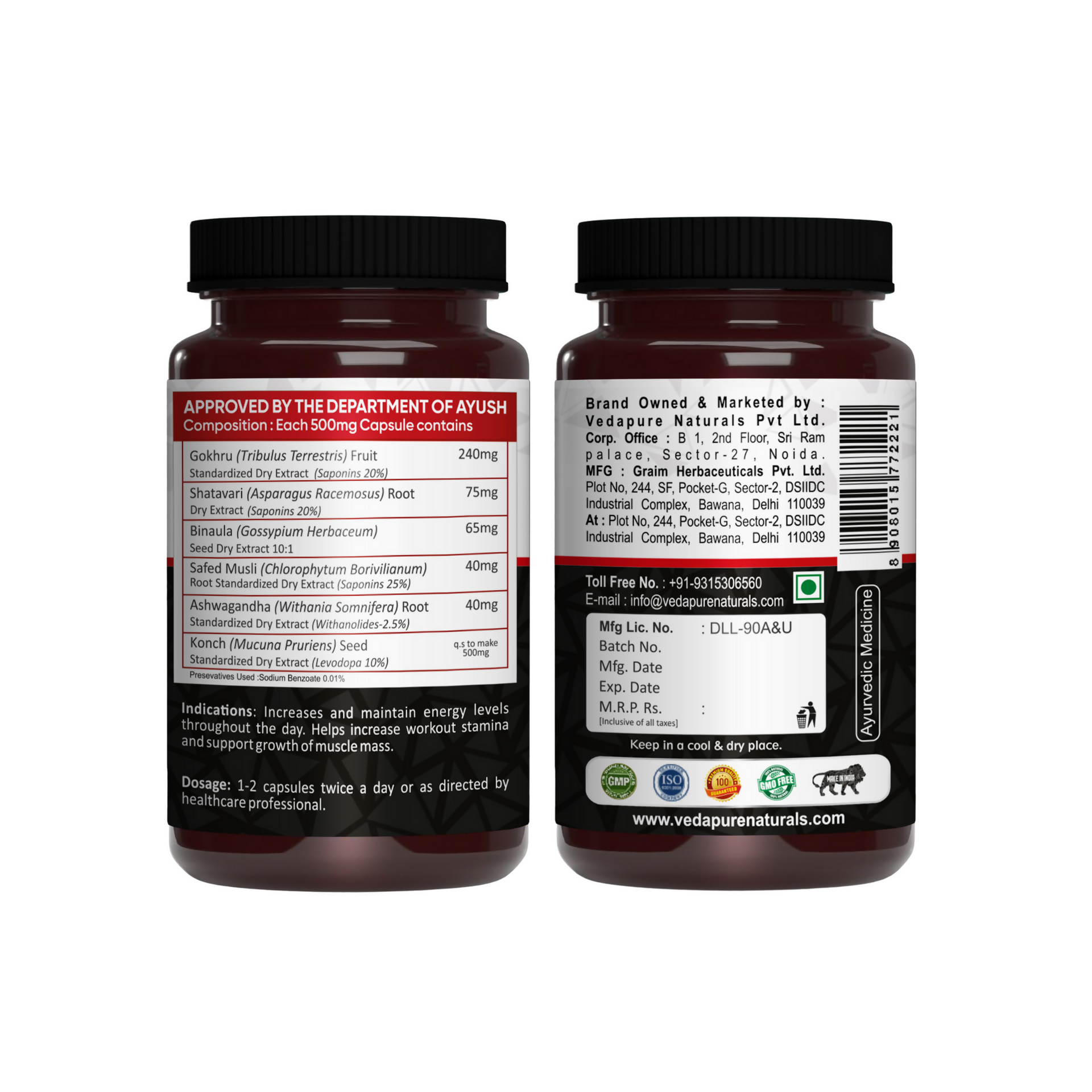 Vedapure Naturals Veda Testo-19 Capsules Anabolic Booster- Chota Gokhru, Shatavari, Safed Musli, Ashwagandha extracts - 60 Capsules