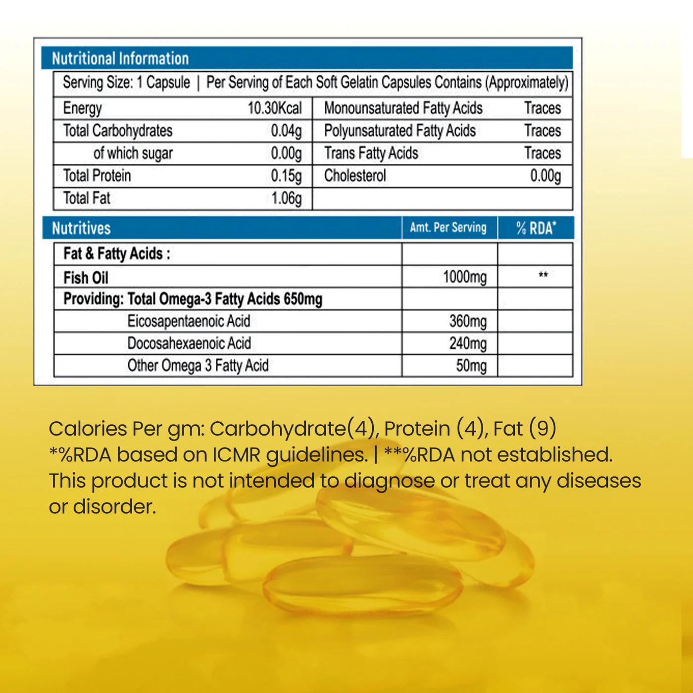 Vedapure Naturals Double Strength Omega 3 Fish Oil capsules, enriched with EPA(360mg) and DHA(240mg) fatty acids, are highly beneficial for eyes, bones, joint, brain, and heart health. These fatty acids which are considered 'Good Fat" cannot be produced by our bodies. However, they are highly required for various activities including brain and heart functioning. So, we need to take them from outside sources. Such healthy fats are directly equivalent to consuming a good amount of fatty acids from a fish. If you don’t prefer to eat fish, you can depend on these EPA and DHA fatty acids.