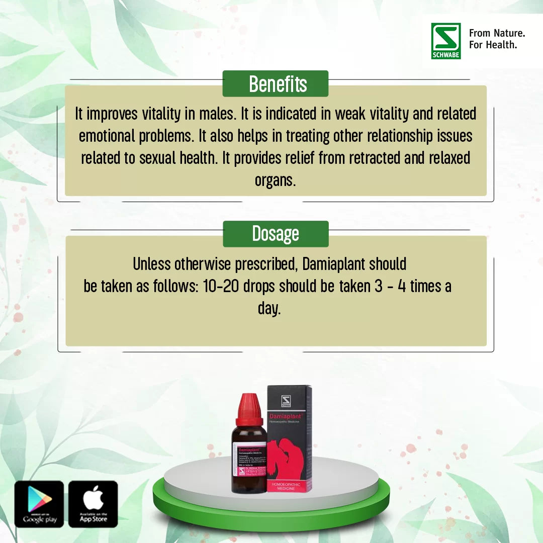 Dr Willmar Schwabe India Damiaplant Drop is a homoeopathic medicine that helps boost vigour and vitality in men. It contains a blend of potent ingredients with aphrodisiac and antidepressant properties.
