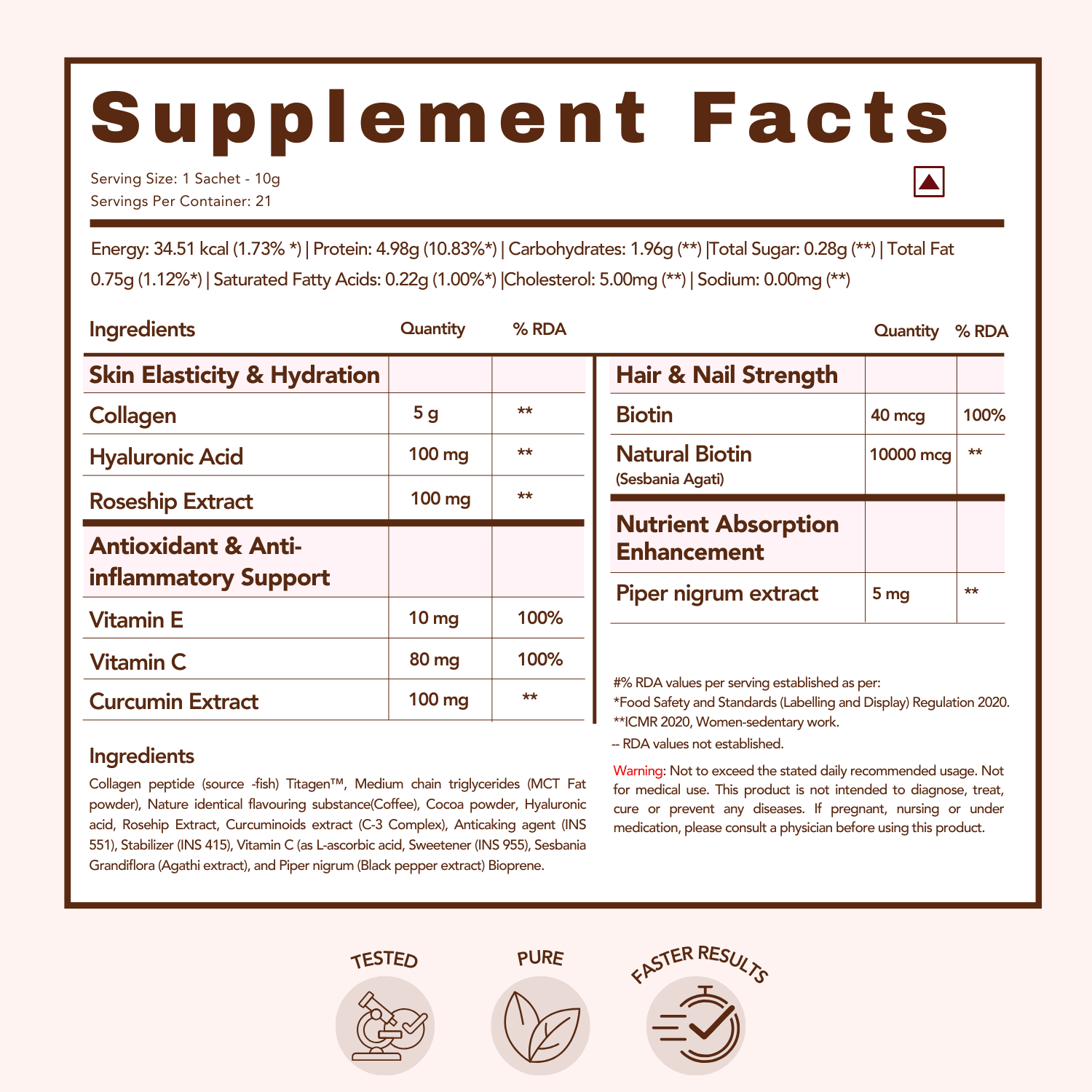 - Each serving (10 gram) contains: Collagen Peptide (Source: Fish) Titagen, MCT Fat Powder, Natural Flavor (Coffee), Cocoa Powder, Hyaluronic Acid, Roseship Extract, Curcuminoids Extract (C-3 Complex), Anticaking Agent (INS 551), Stabilizer (INS 415), Vitamin C (L- ascorbic acid), Sweetener (INS 955), Sesbania Grandiflora (Agathi Extract), Piper Nigrum (Black Pepper Extract) Bioprene
