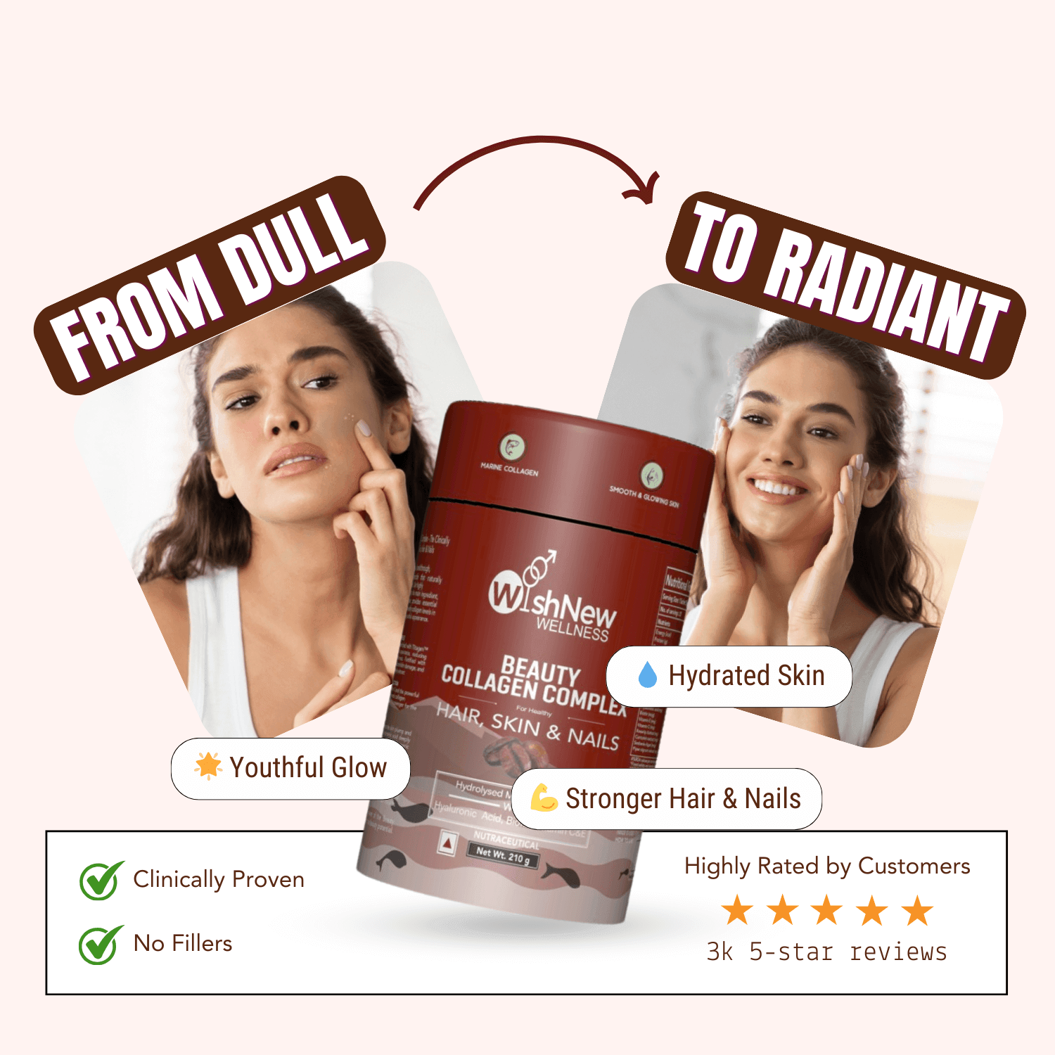 Wishnew Wellness Beauty Collagen Complex Sachet (10gm Each) for Healthy Hair, Skin and Nails with Hydrolysed Marine Collagen Hyaluronic Acid, Biotin and Vitamin C Coffee offers a premium blend designed to support healthy hair, skin, and nails. Each serving provides a unique combination of hydrolyzed marine collagen, hyaluronic acid, biotin, and vitamin C for radiant beauty from within. Enriched with natural biotin from Sesbania Grandiflora and dual antioxidant protection from vitamins E and C, this collagen blend helps to maintain skin elasticity, strength, and overall wellness. With added prebiotics for enhanced nutrient absorption, it supports both beauty and gut health. Sweetened with sucralose, this delicious coffee-flavoured sachet makes your daily beauty ritual enjoyable and effective.