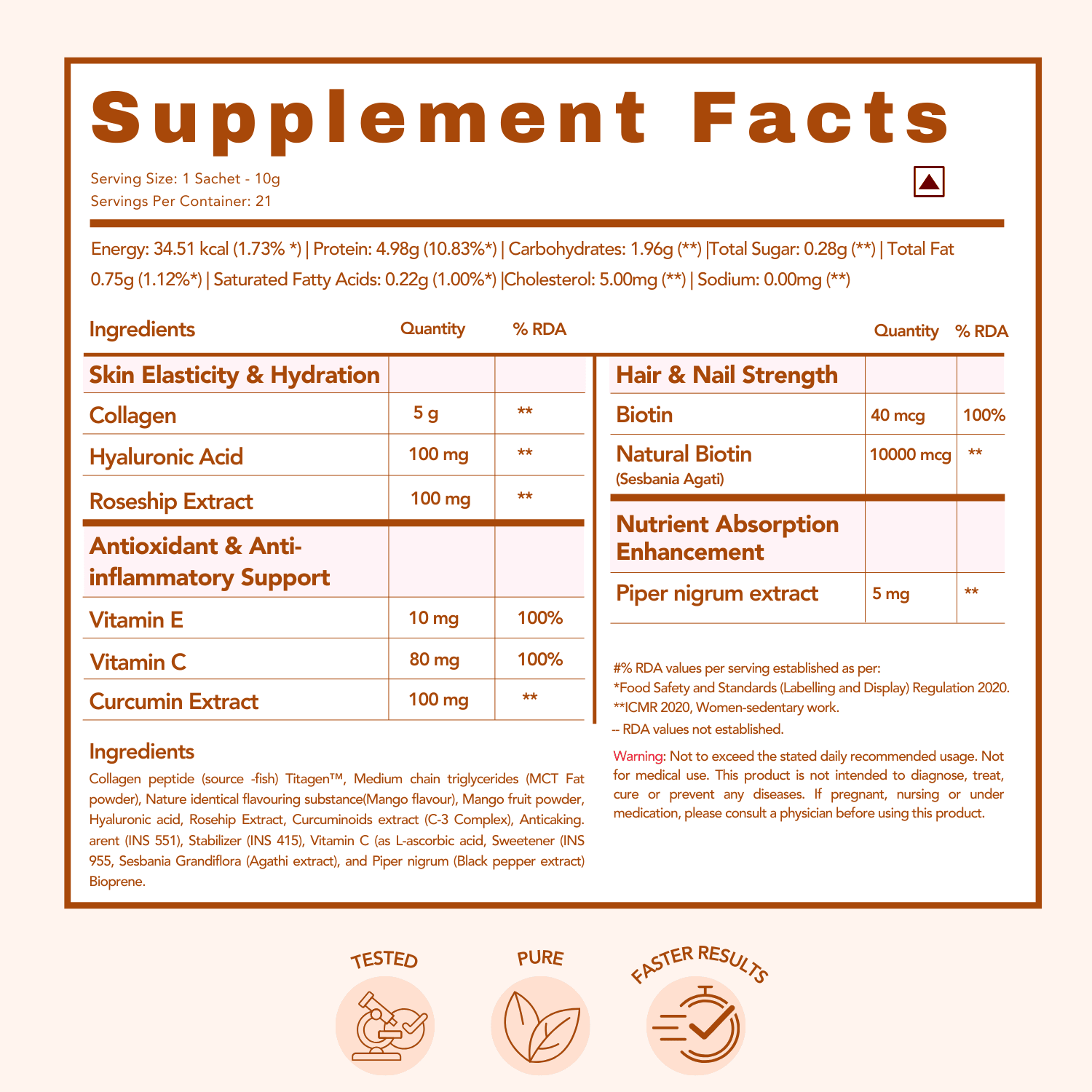 Each serving (10 gram) contains: Collagen Peptide (Source: Fish), Titagen, Isomaltose Oligosaccharide, Natural Flavor (Mango), Mango Fruit Powder, Hyaluronic Acid, Roseship Extract, Curcuminoids Extract (C-3 Complex), Anticaking Agent (INS 551), Stabilizer (INS 415), Vitamin C (L-ascorbic acid), Sweetener (INS 955), Sesbania Grandiflora (Agathi Extract), Piper Nigrum (Black Pepper Extract) Bioprene.