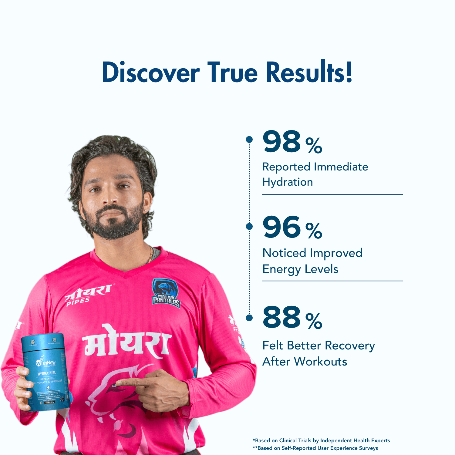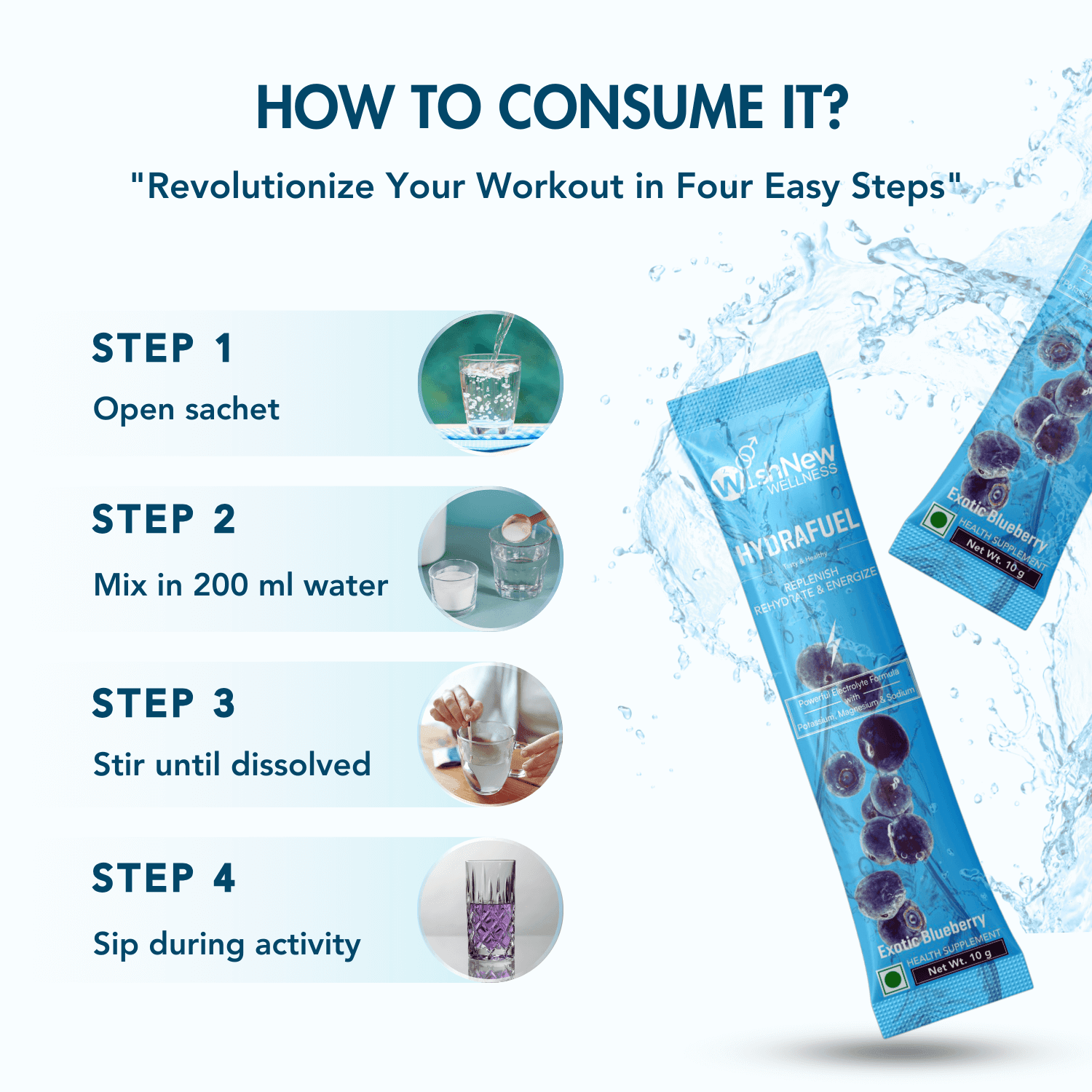 WishNew Wellness Hydrafuel Instant Energy Drink Mix Sachet is a hydration and energy solution designed to support electrolyte balance, muscle recovery, and better performance. This nutraceutical contains essential electrolytes such as sodium, potassium, magnesium, and calcium, potentially ensuring optimal hydration during intense physical activity or daily routines. HydraFuel offers a unique 2:1 glucose-to-fructose ratio, and can help improve carbohydrate absorption for prolonged energy. Its natural blueberry flavour, sweetened with monk fruit, makes staying hydrated a refreshing experience. This product contains no artificial preservatives and meets all regulatory standards. Suitable for athletes and individuals seeking daily hydration and energy support.