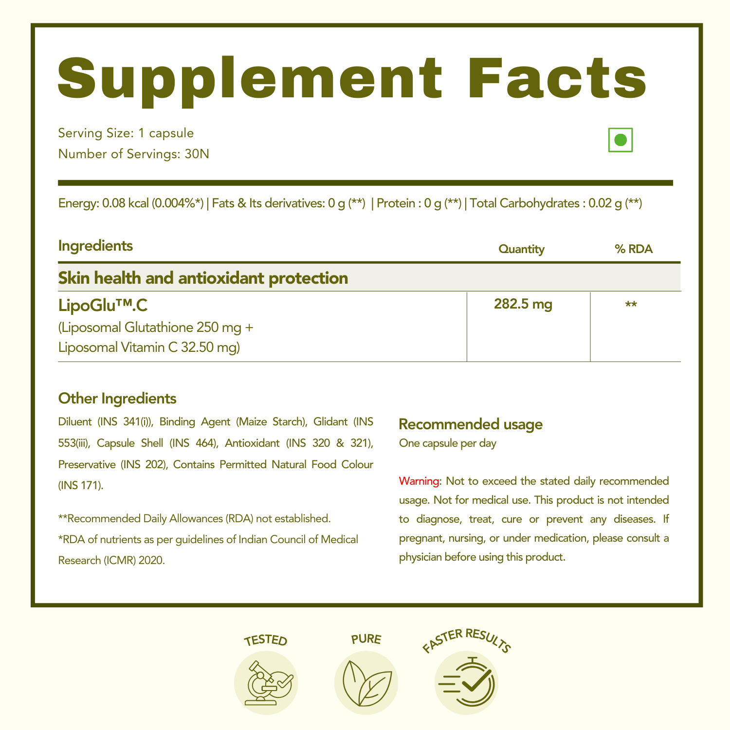 - Each capsule contains: Liposomal Glutathione (250 mg), Hydroxypropyl Methylcellulose, Sunflower Oil, Antioxidants (INS 320, INS 321), Diluent (INS 460(i), INS 341(ii)), Binding Agent (Maize Starch), Anticaking Agent (INS 553(iii)), Preservative (INS 202), Permitted Natural Food Colour