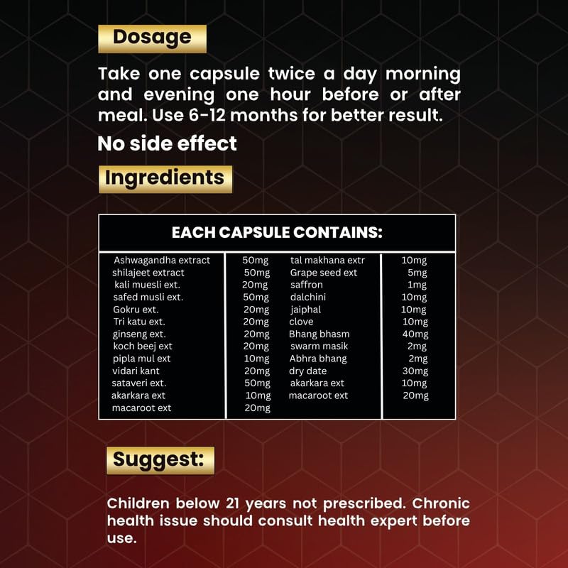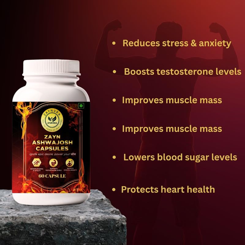 Unleash your peak performance with Zaynura Ayurveda Josh Capsule, a premium Ayurvedic blend crafted for men seeking unparalleled vitality, vigor, stamina, and endurance. Infused with over 20 potent herbs like Shilajit, Safed Musli, Ashwagandha, Ginseng, and Swarna Makshik Bhasma, this scientifically formulated capsule enhances energy, supports libido, and promotes overall wellness. Pair it with Zaynura Men’s Massage Oil for a holistic approach to vitality and confidence. Designed for the modern man, Zaynura’s 100% natural, vegetarian formula ensures safety and efficacy without compromise.