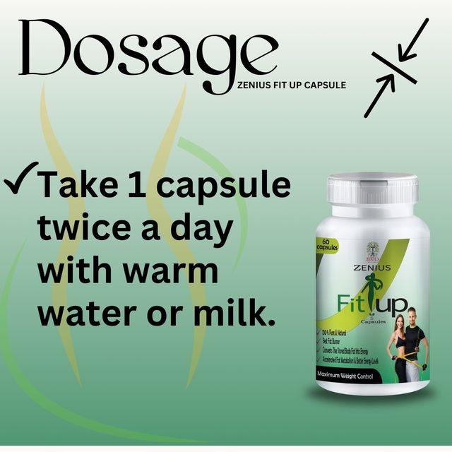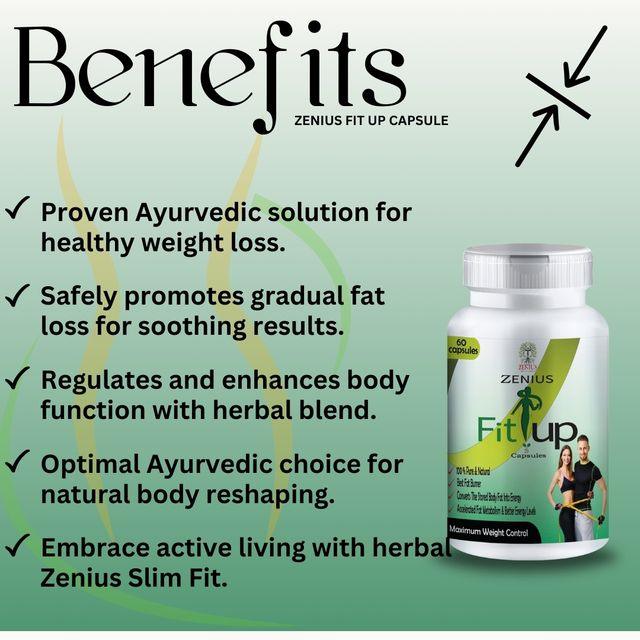 - Zenius Fit Up Capsules, an Ayurvedic weight loss solution, operates at the core of the human body, initiating with the digestive function. By correcting digestion, it enhances food assimilation, leading to improved satisfaction and increased energy production.