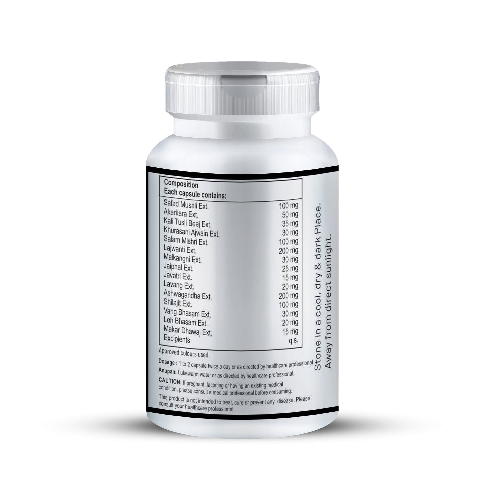 Safad Musail Ext., akarkara exr., kali tusli ext., khurasani ajawain ext., salam mishri ext., lajwanti ext., malkangni ext., jaiphal ext., javatri ext., lavang ext., ashwagandha ext., shilajit ext., vang bhasam ext.,loh bhasam ext., makar dhawaj ext.