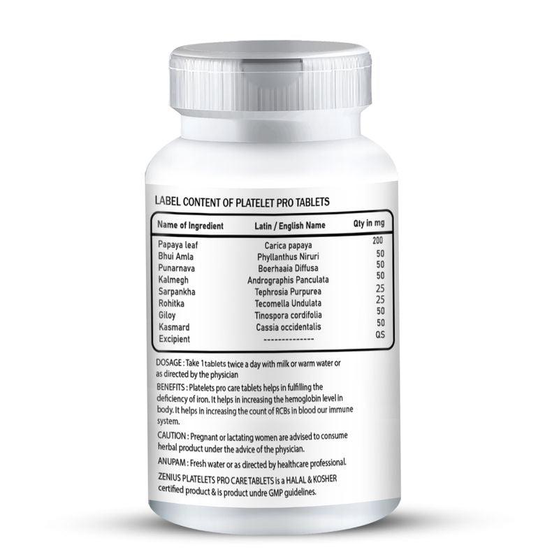 Zenius Platelet Pro tablet is a unique blend carefully formulated to naturally support and increase blood platelets. Packed with powerful ingredients like Papaya leaf, Bhui Amla, Punarnava, Kalmegh, Sarpankha, Rohitka, Giloy, and Kasmard, this supplement aims to enhance platelet production and overall blood health. Embrace the holistic benefits of Zenius Platelet Pro tablet, promoting optimal platelet levels and fostering a healthier blood profile with nature's finest ingredients.