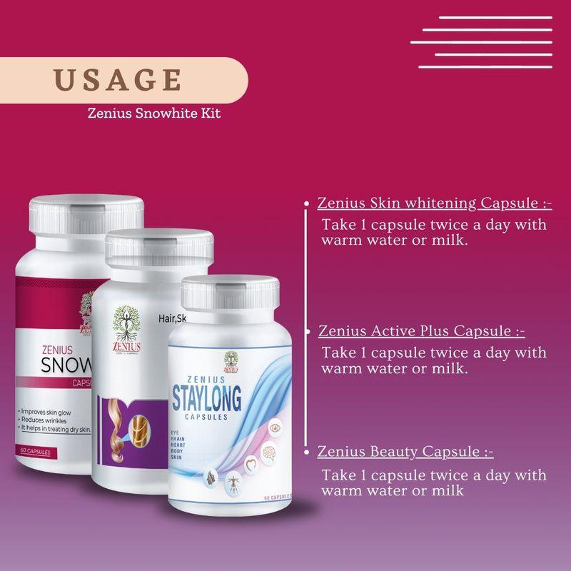 Zenius Snowhite Kit is a comprehensive skincare solution, promoting authentic skin health in both physiological and psychological aspects. Harnessing the power of Glutathione, a potent antioxidant widely used in the beauty care industry, this kit offers a natural remedy for various skin concerns. The capsule works to reduce melanin pigments, combat free radicals, and unleash anti-aging properties, maintaining an optimal pH balance. With ingredients like Rosehips, Vitamin C, Grape Seed Extract, Lemon Extract, Malic Acid, and Niacinamide, the kit aids in skin cleansing, reducing blemishes, and safeguarding against harmful UV rays. Vitamin C imparts a natural glow, keeping the skin youthful, hydrated, and fresh. Enjoy moisturized and radiant skin for a perfect look.