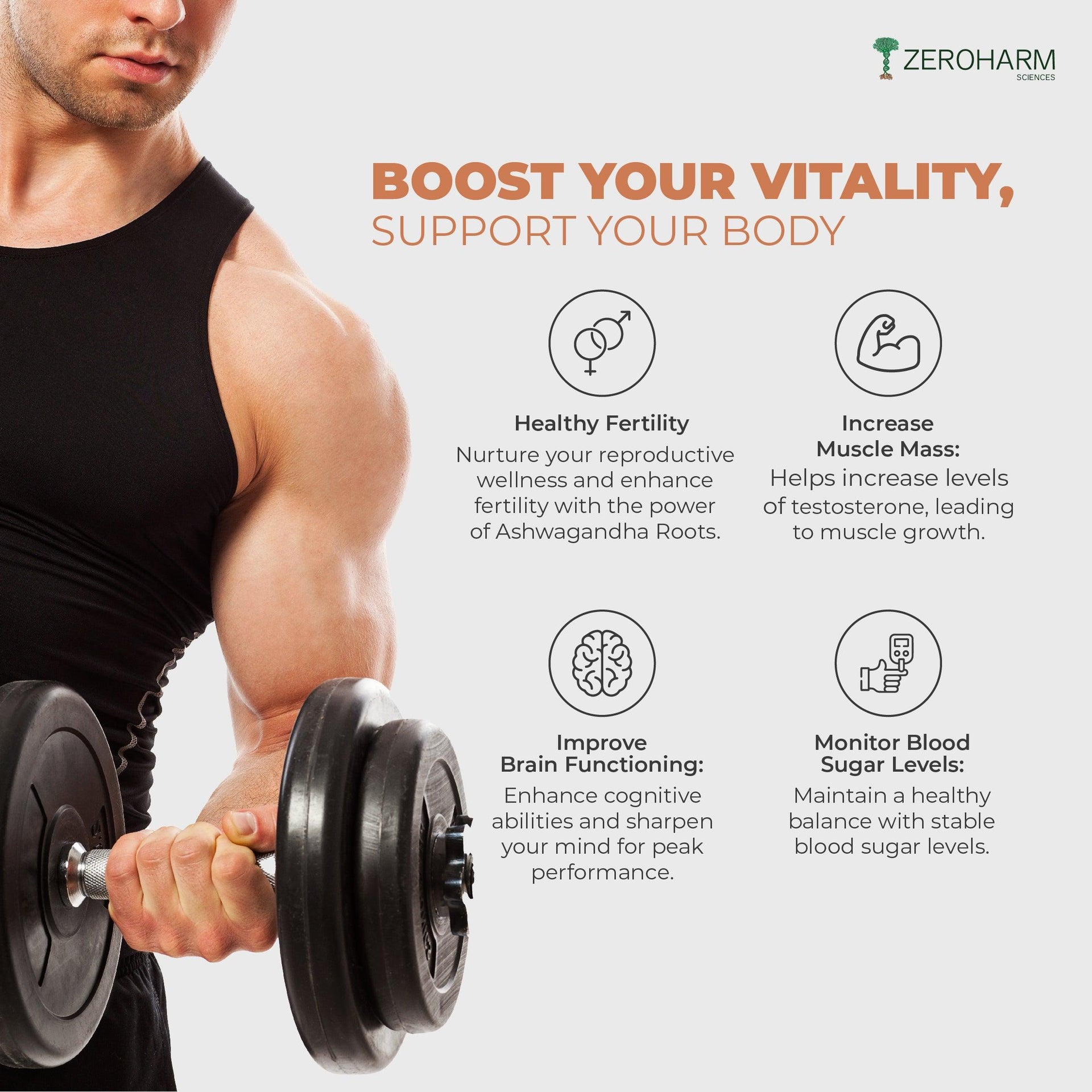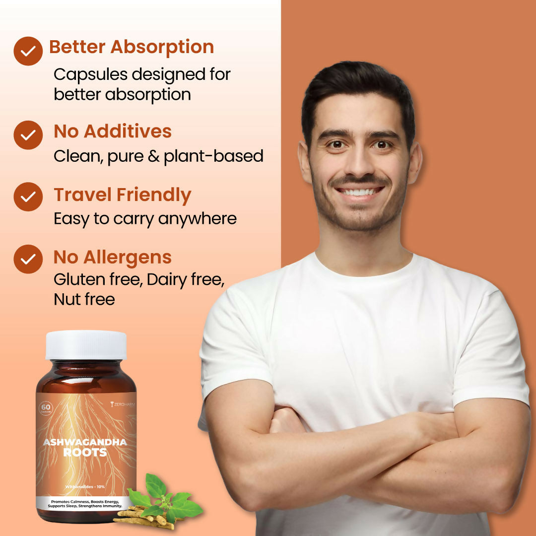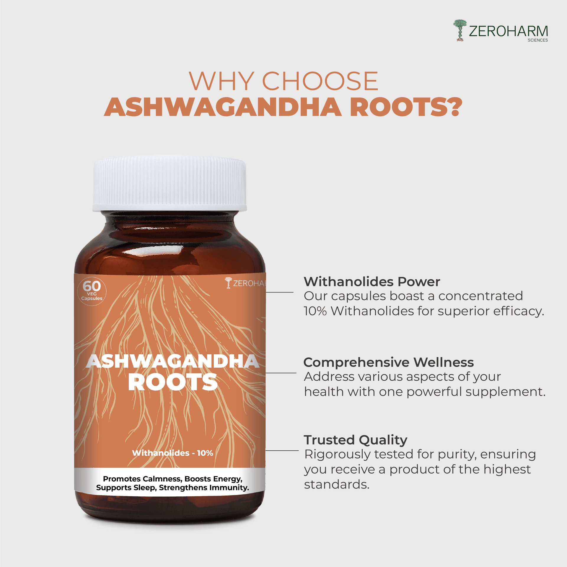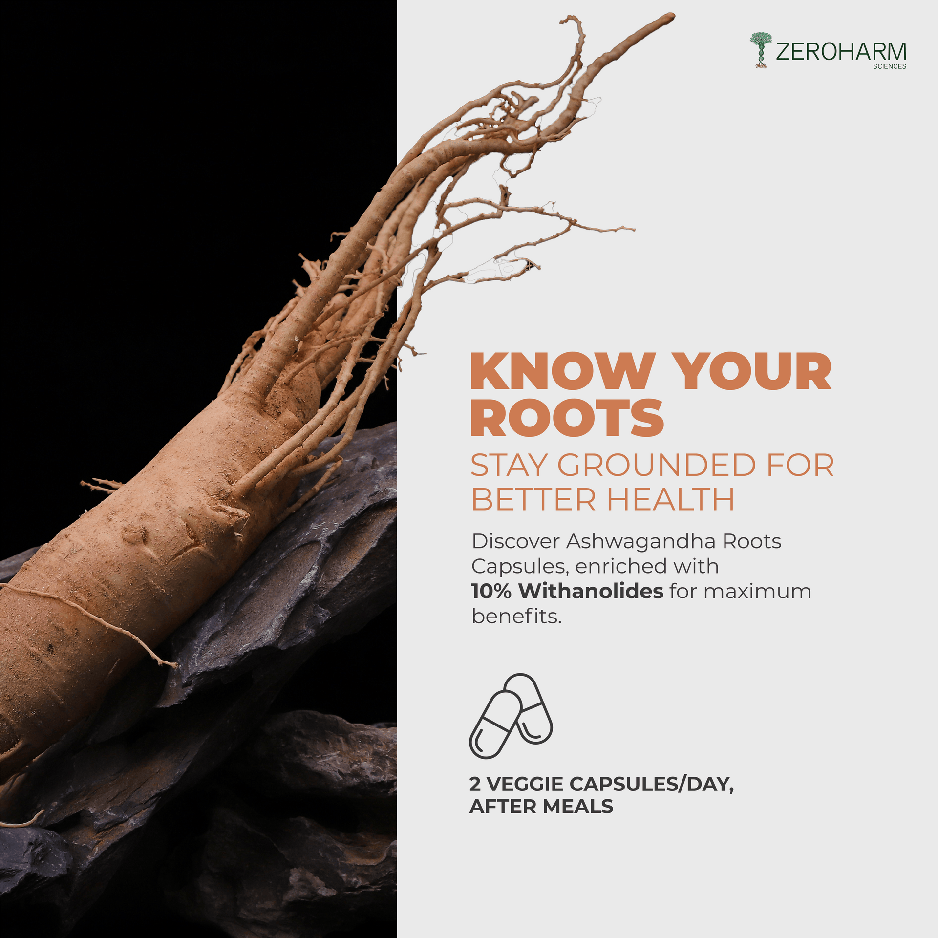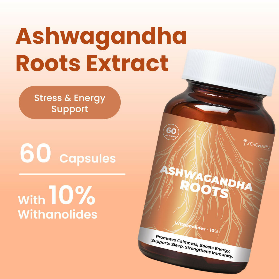 Zeroharm Ashwagandha Roots Capsules - Experience the power of Ashwagandha Roots Capsule, enriched with high concentrations of Withanolides (10%). This herbal supplement is derived from the potent roots of Ashwagandha, addressing a range of health concerns, from stress and anxiety relief to boosting cognitive functioning. With a focus on your overall well-being, this capsule also aids in sleep disorders, fertility, muscle mass improvement, and blood sugar level maintenance. It is 100% natural, extracted from roots only in its purest form.