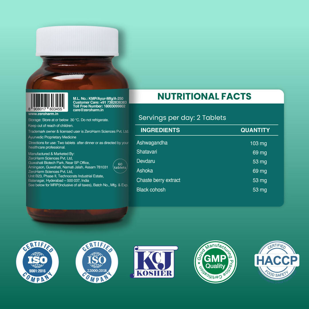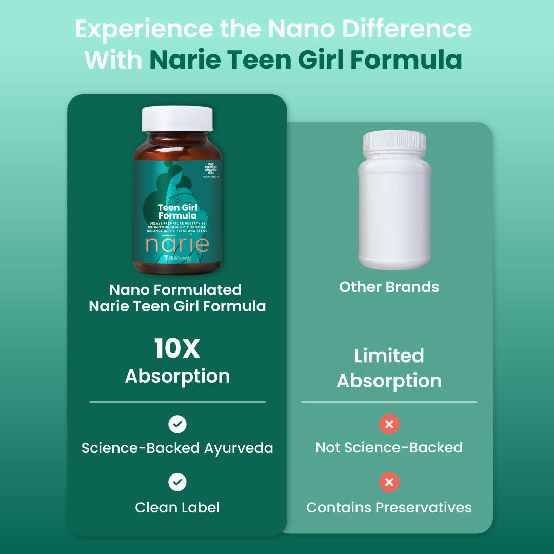 Zeroharm Sciences Narie Teen Girl Formula Tablet is a plant-based supplement powered with Shatavari, devdaru, ashoka, black cohosh, and chaste berry to promote hormonal balance, prevent early puberty, support smooth puberty transition, and assist in dealing with physiological and emotional puberty changes.